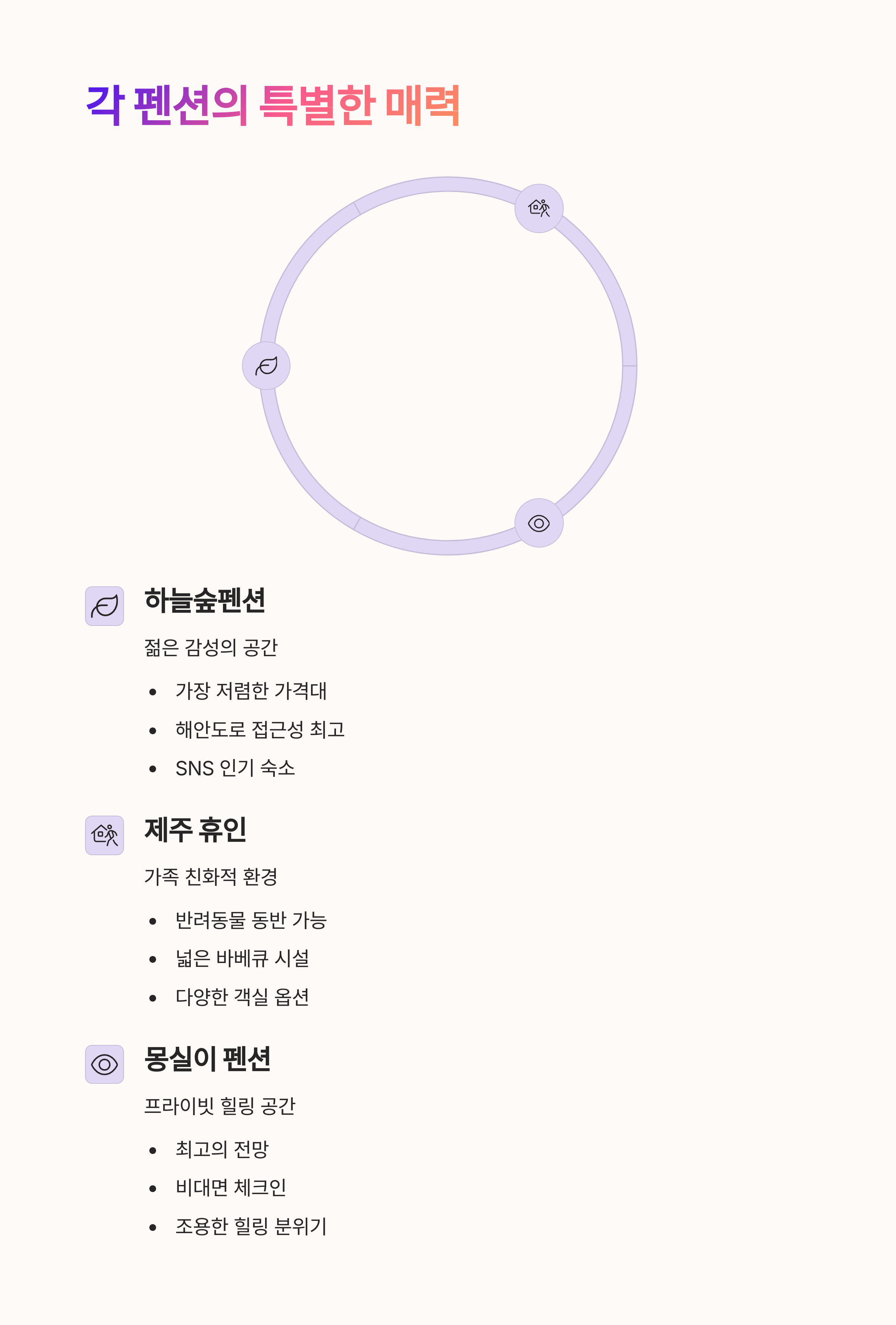 | Q. 제주 애월 펜션 추천 TOP3의 특징을 한눈에 정리한다면? |
