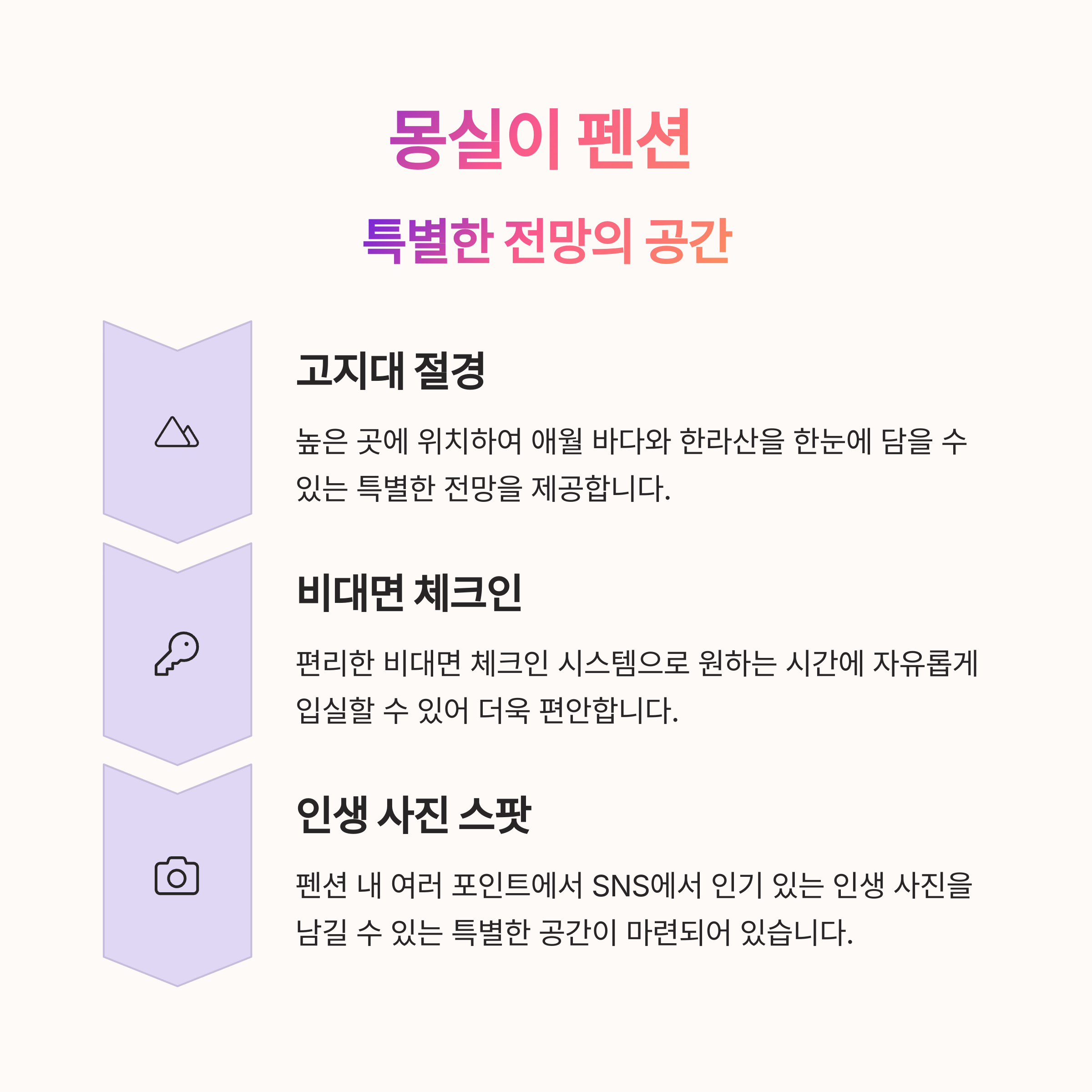 | 각 펜션은 특색 있는 장점이 있으며 여행 목적에 따라 선택할 수 있습니다. 프론트 제주 하늘숲펜션은 경제적인 가격과 프라이빗한 공간이 매력적입니다. 이니히제주 펜션은 깔끔한 인테리어와 비대면 체크인 편의성이 돋보입니다. 제주 휴인 애월 펜션은 넓은 공간과 가족 및 반려동물 동반 가능으로 호평받고 있습니다. 모든 펜션은 접근성이 좋고 애월 지역의 자연경관을 최대한 즐길 수 있습니다. |