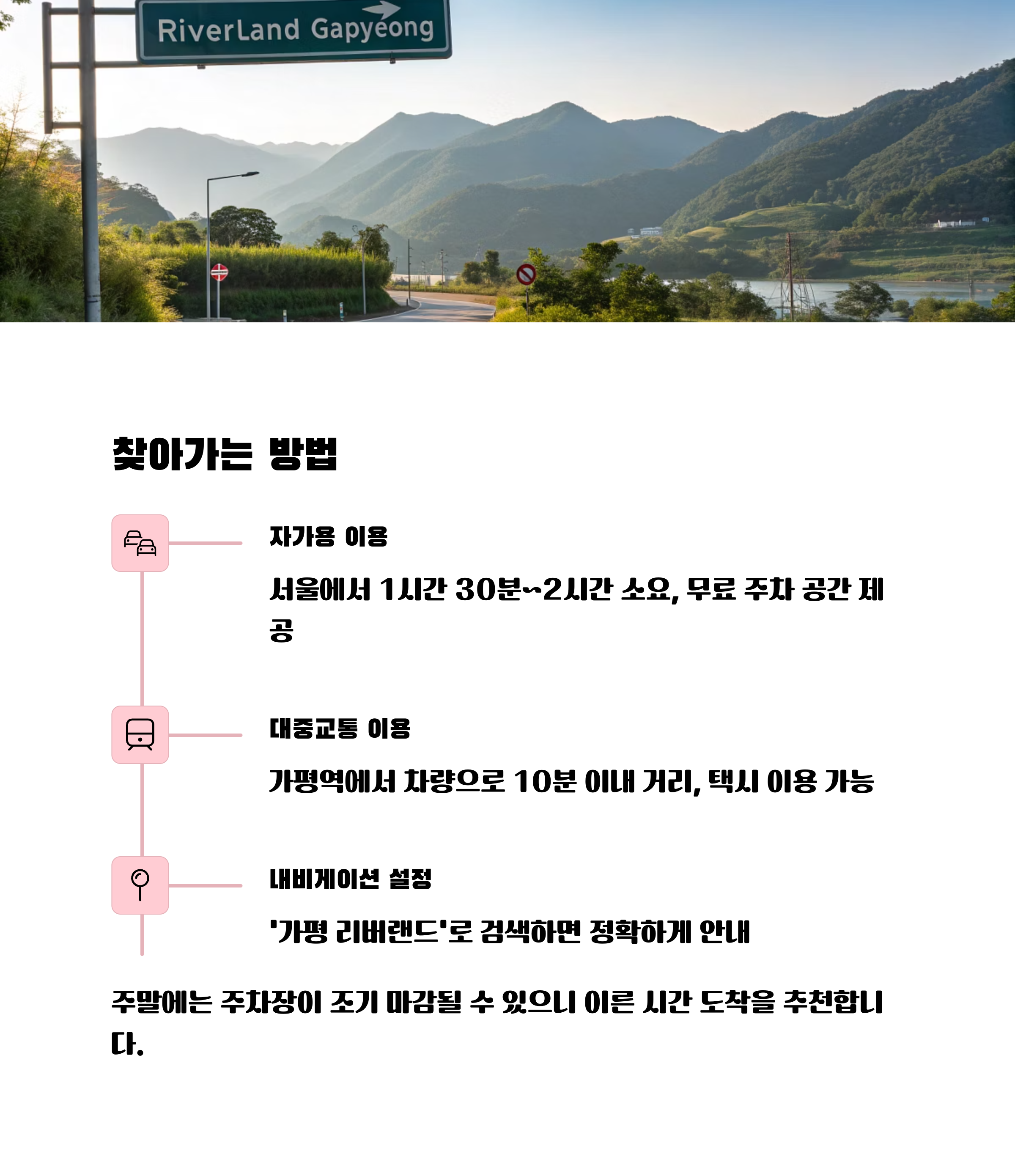 서울에서 가평까지는 차량 기준 1시간 30분~2시간 정도 소요되며, 리버랜드는 가평역에서 차량으로 10분 이내 거리에 위치해 있어 대중교통 이용 후 택시를 타도 부담이 적은 편입니다.