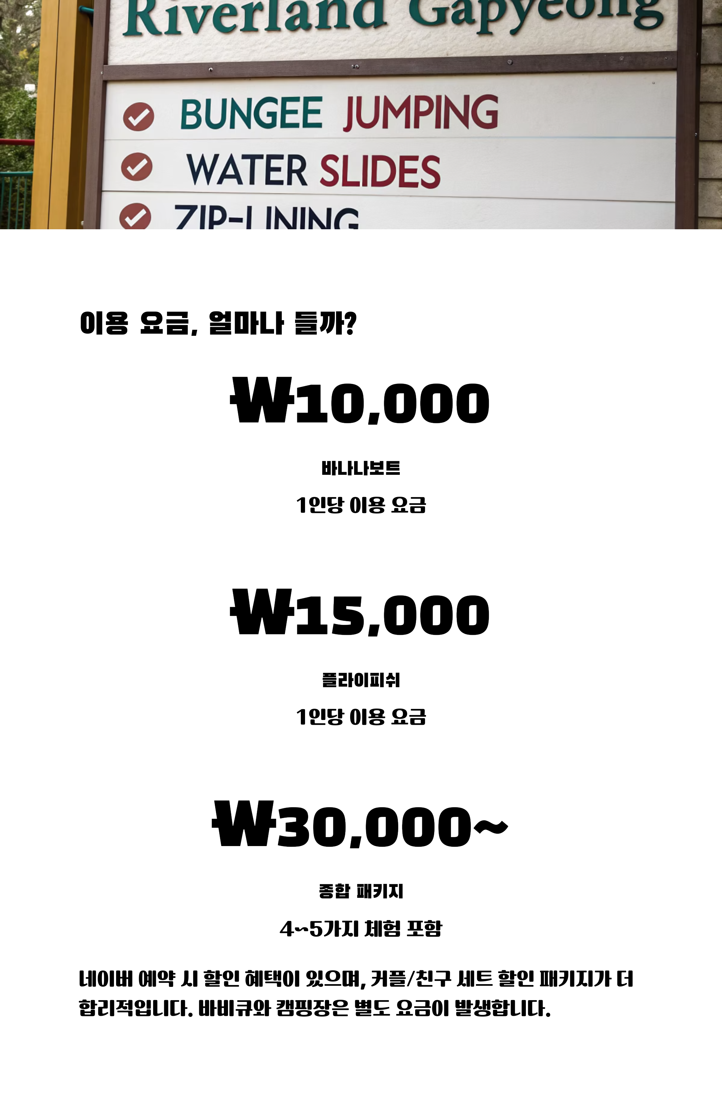리버랜드는 개별 액티비티 별 이용 요금과 종합 패키지 요금 두 가지 형태로 운영됩니다. 예를 들어, 바나나보트는 1인당 1만원, 플라이피쉬는 1인당 1만 5천원 정도이며, 종합 패키지는 4~5가지 체험을 포함해 3~4만원 선입니다.