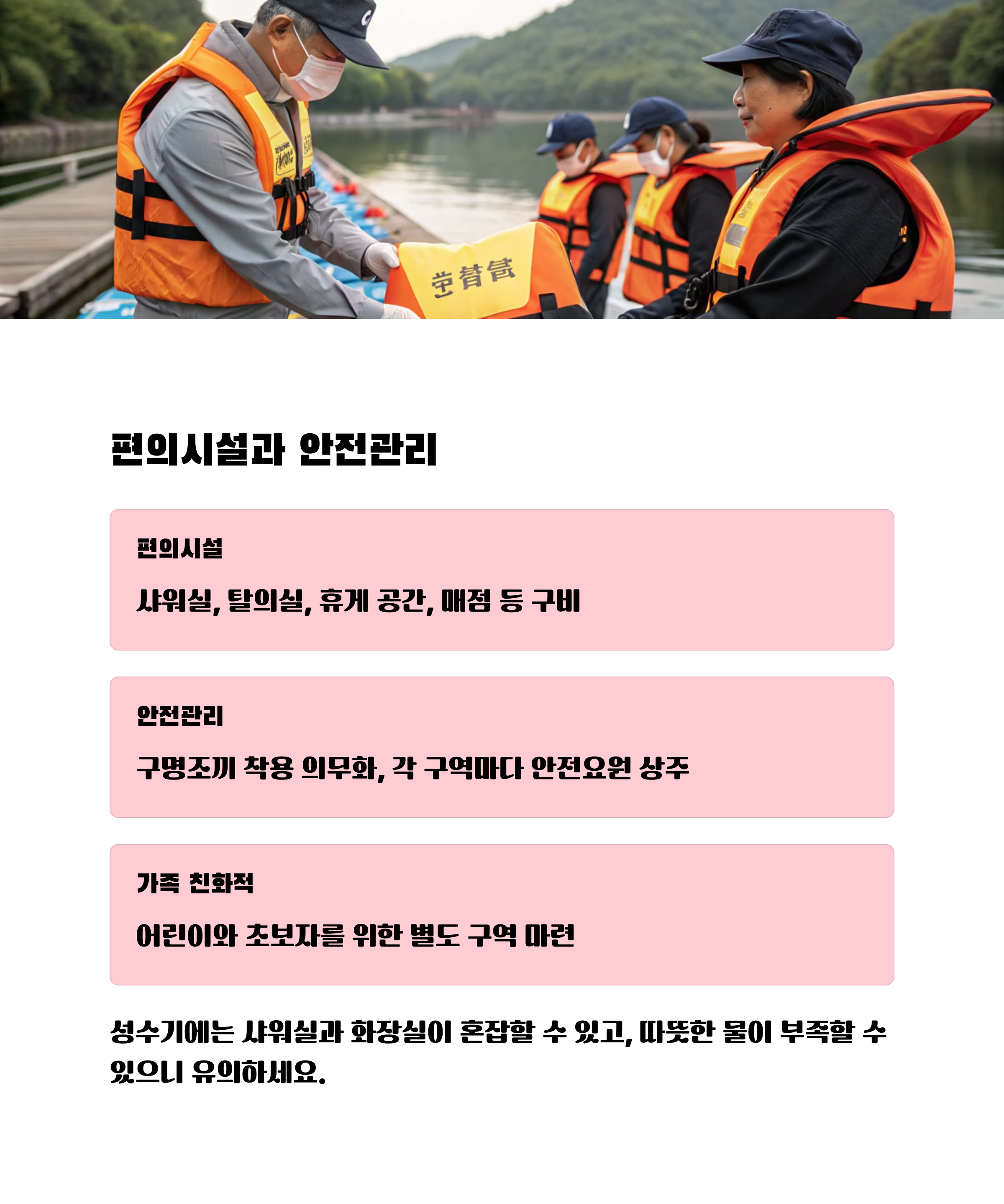 전반적으로 안전관리나 구조 요원의 태도는 친절하고 전문적이라는 후기가 많으며, 기본적인 안전교육도 진행되므로 첫 방문자도 무리 없이 활동이 가능합니다.