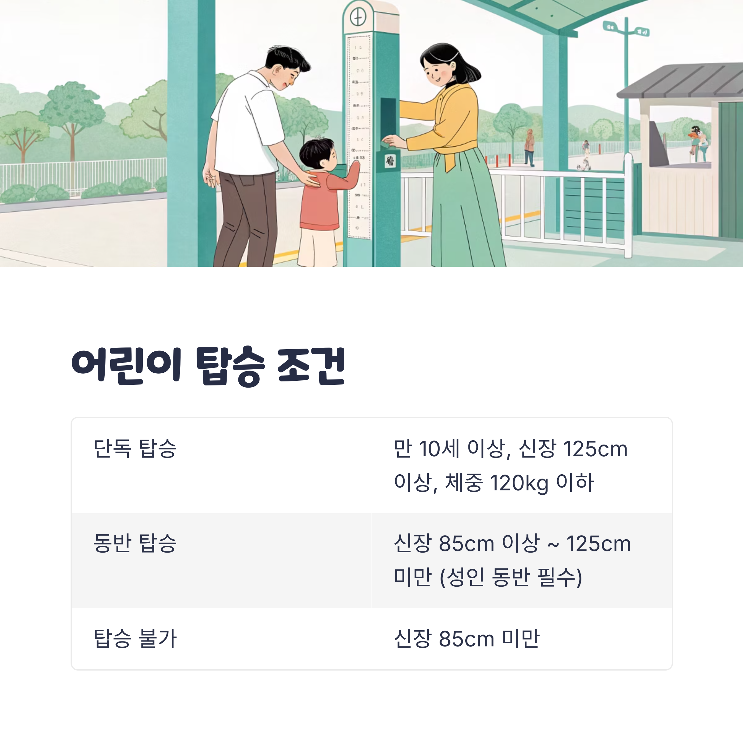 이 조건은 아이의 신체적 안전을 위한 최소 기준이며, 현장에서는 키와 체중을 직접 측정하는 경우도 있습니다. 보호자는 아이가 단독 탑승 가능한 신장 및 나이 조건을 충족하는지 사전에 확인하는 것이 좋습니다.