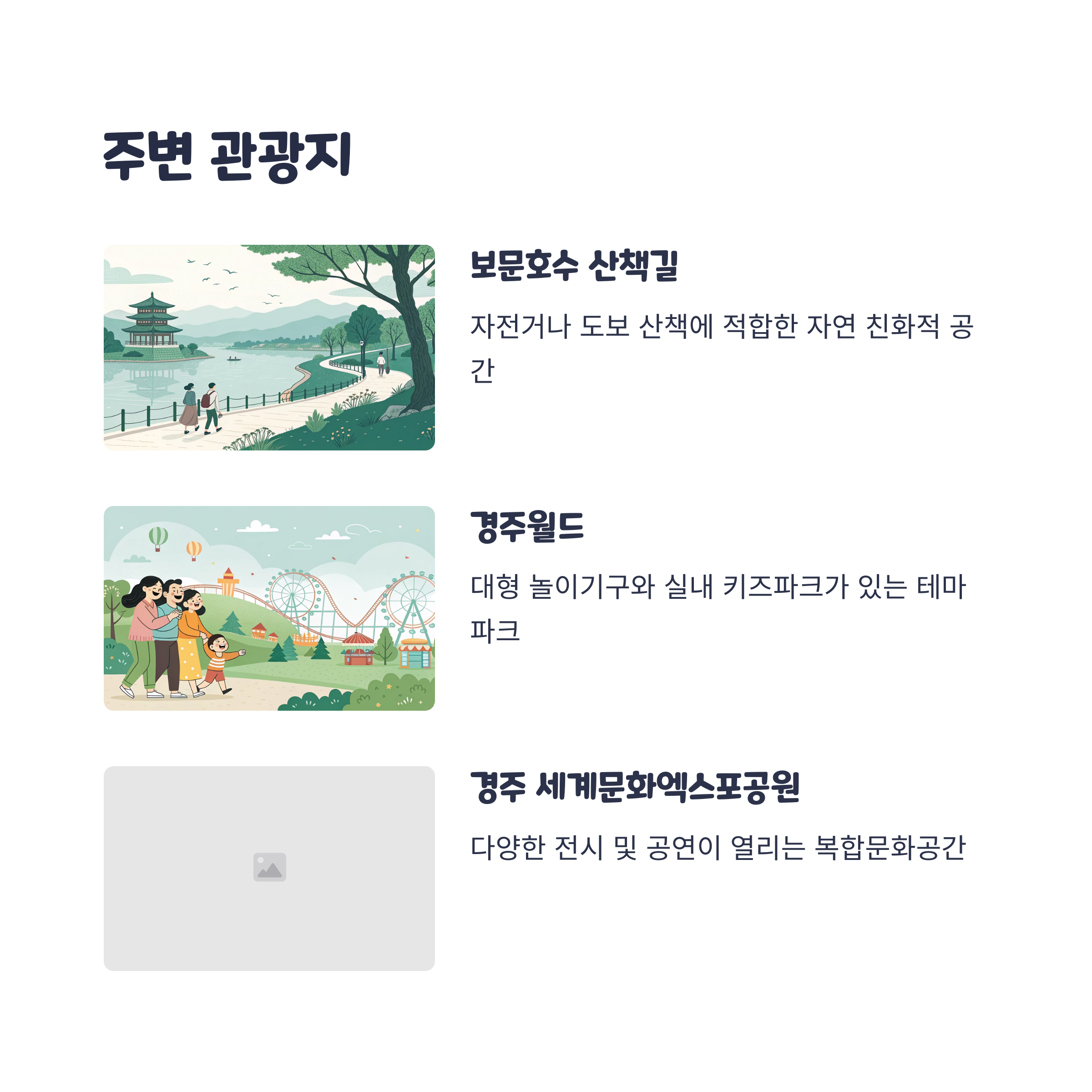 • 보문호수 산책길: 자전거나 도보 산책에 적합한 자연 친화적 공간