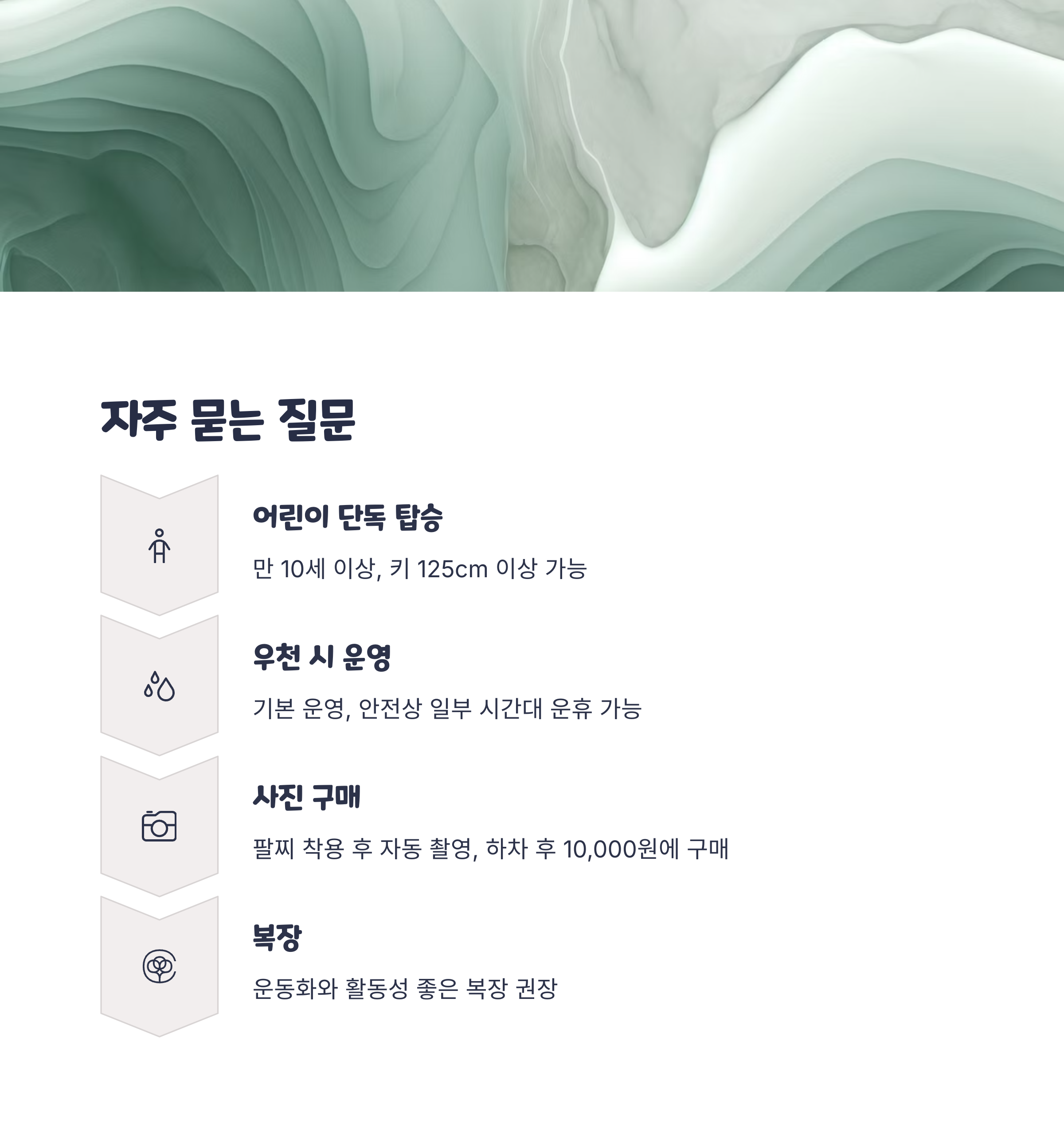 A5. 안전을 위해 운동화와 활동성 좋은 복장을 권장합니다. 슬리퍼, 치마, 모자 등은 제한될 수 있습니다.