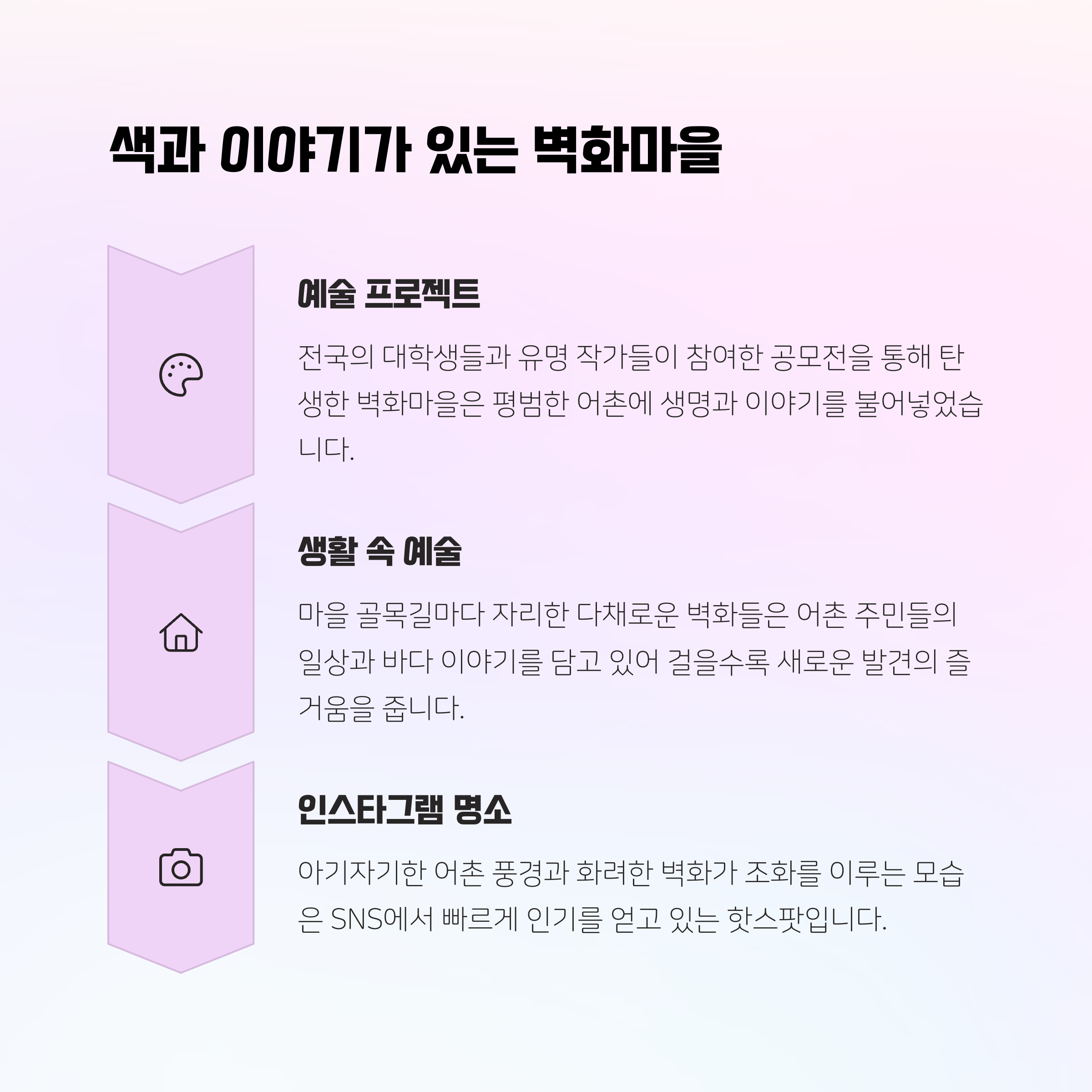 조용한 해안 마을의 아기자기한 매력을 느껴보세요. 벽화거리와 함께하는 특별한 힐링이 여러분을 기다리고 있습니다.