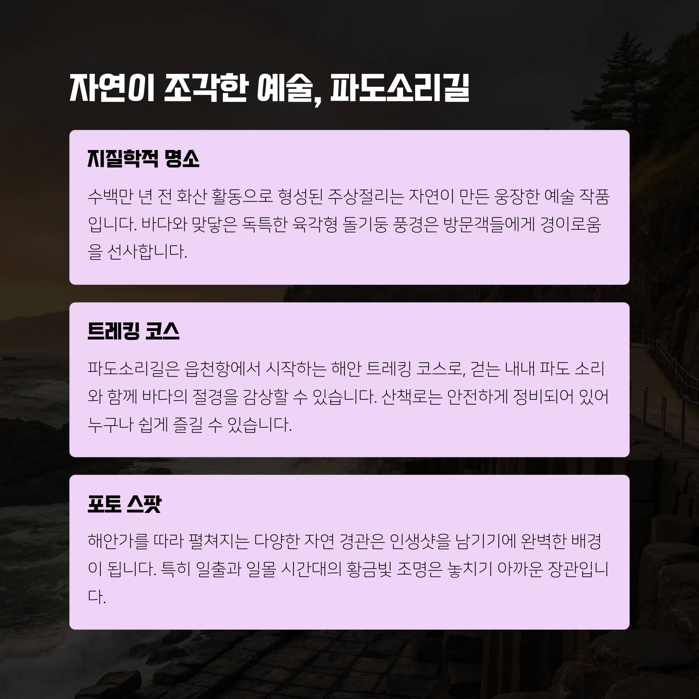 | 주상절리 파도소리길 | 해안가를 따라 걷는 산책로 | 가을, 겨울 |