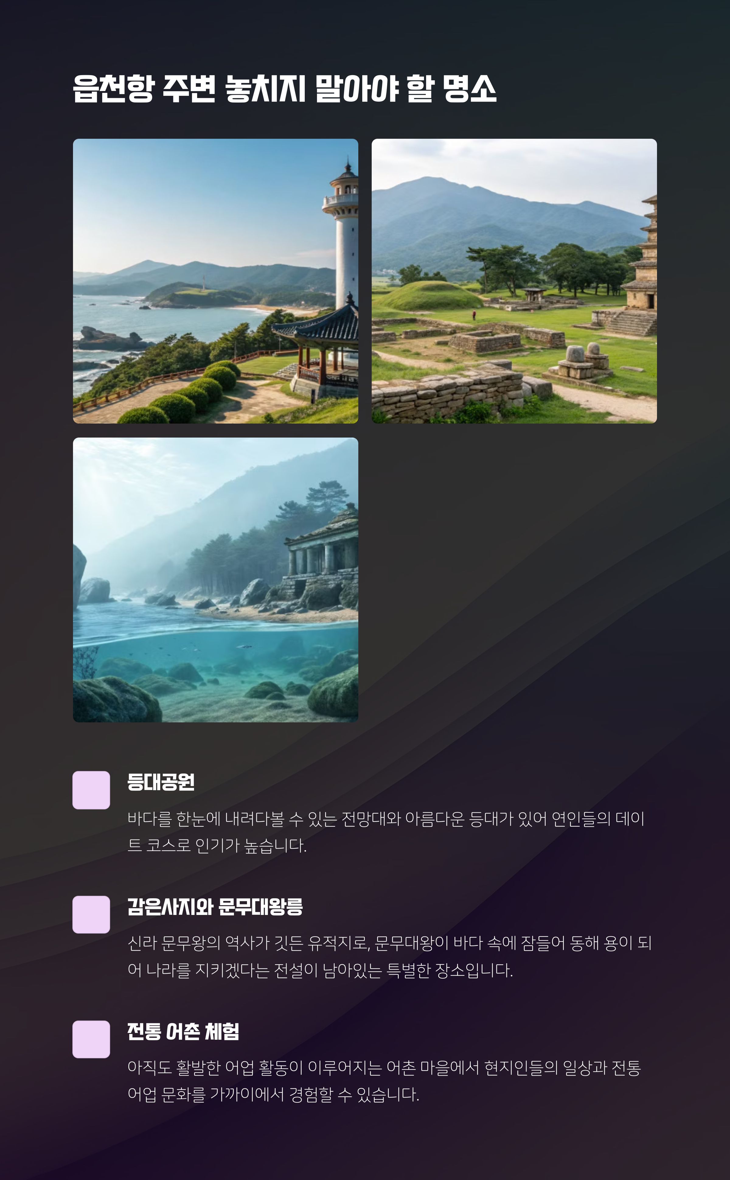 | 읍천 벽화거리 근처에는 주상절리 파도소리길, 감은사지, 문무대왕릉이 있습니다. 주상절리 파도소리길은 해안 절경을 즐기며 산책할 수 있는 명소로 특히 인기가 많습니다. 감은사지는 신라 시대 역사를 느낄 수 있는 유적지로 고즈넉한 분위기를 자랑합니다. 문무대왕릉은 동해를 바라보며 역사와 자연의 조화를 느낄 수 있는 특별한 관광지입니다. 각각의 명소는 벽화거리와 차량으로 짧은 거리 안에 있어, 하루 코스로 방문 가능합니다. |