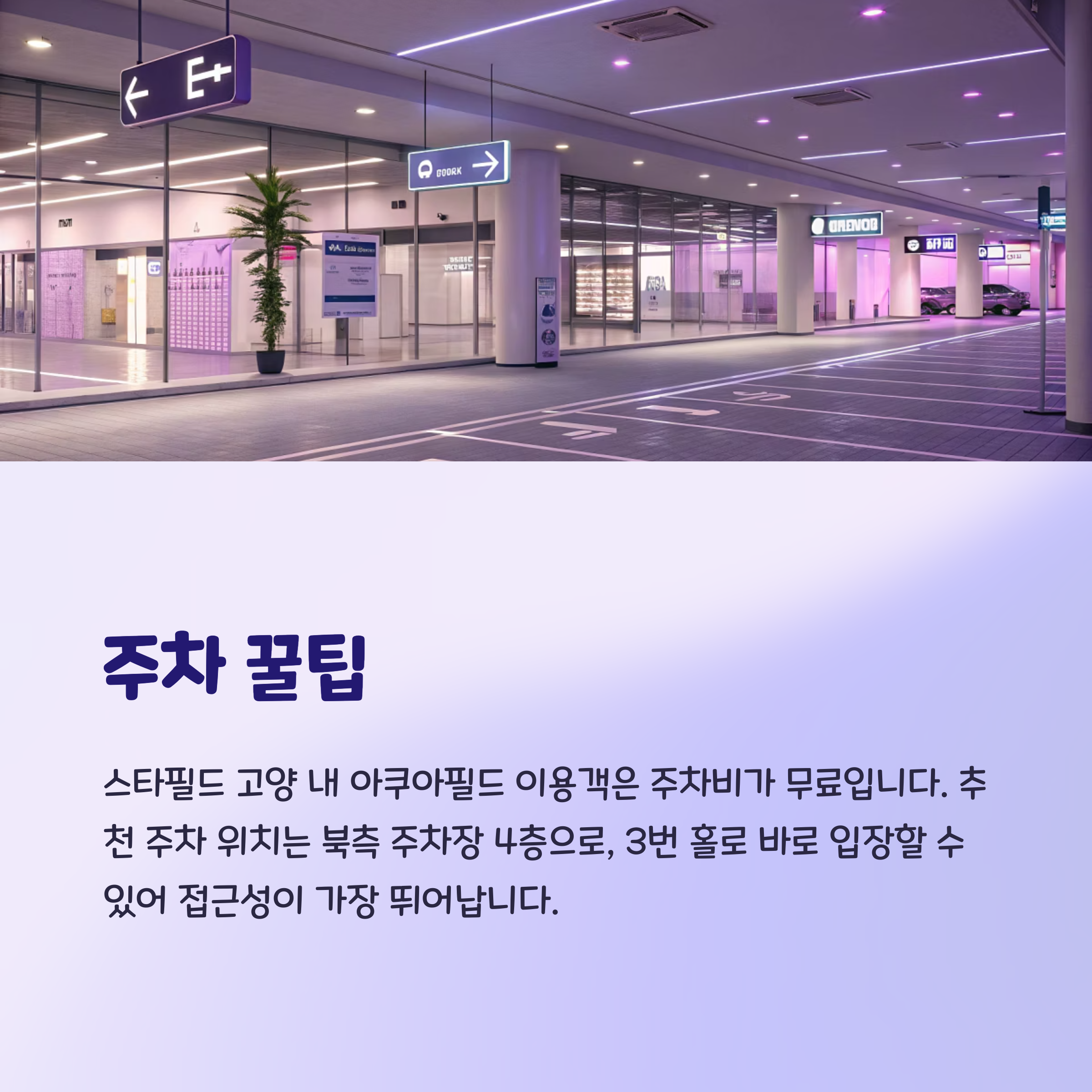 스타필드 고양 내 아쿠아필드 이용객은 주차비가 무료입니다. 하지만 넓은 주차 공간 특성상 최적의 주차 구역을 선택하는 것이 이용 편의성에 큰 영향을 줍니다.