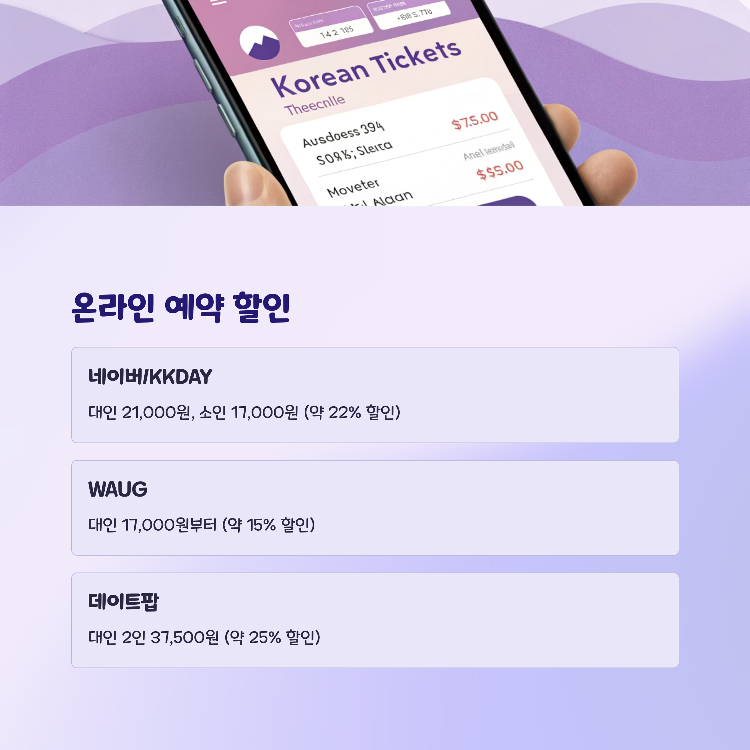 사전 온라인 예약을 통해 정가 대비 높은 할인율을 적용받을 수 있습니다. 특히 플랫폼별로 제공하는 혜택이 상이하므로 비교 후 예매하는 것이 중요합니다.