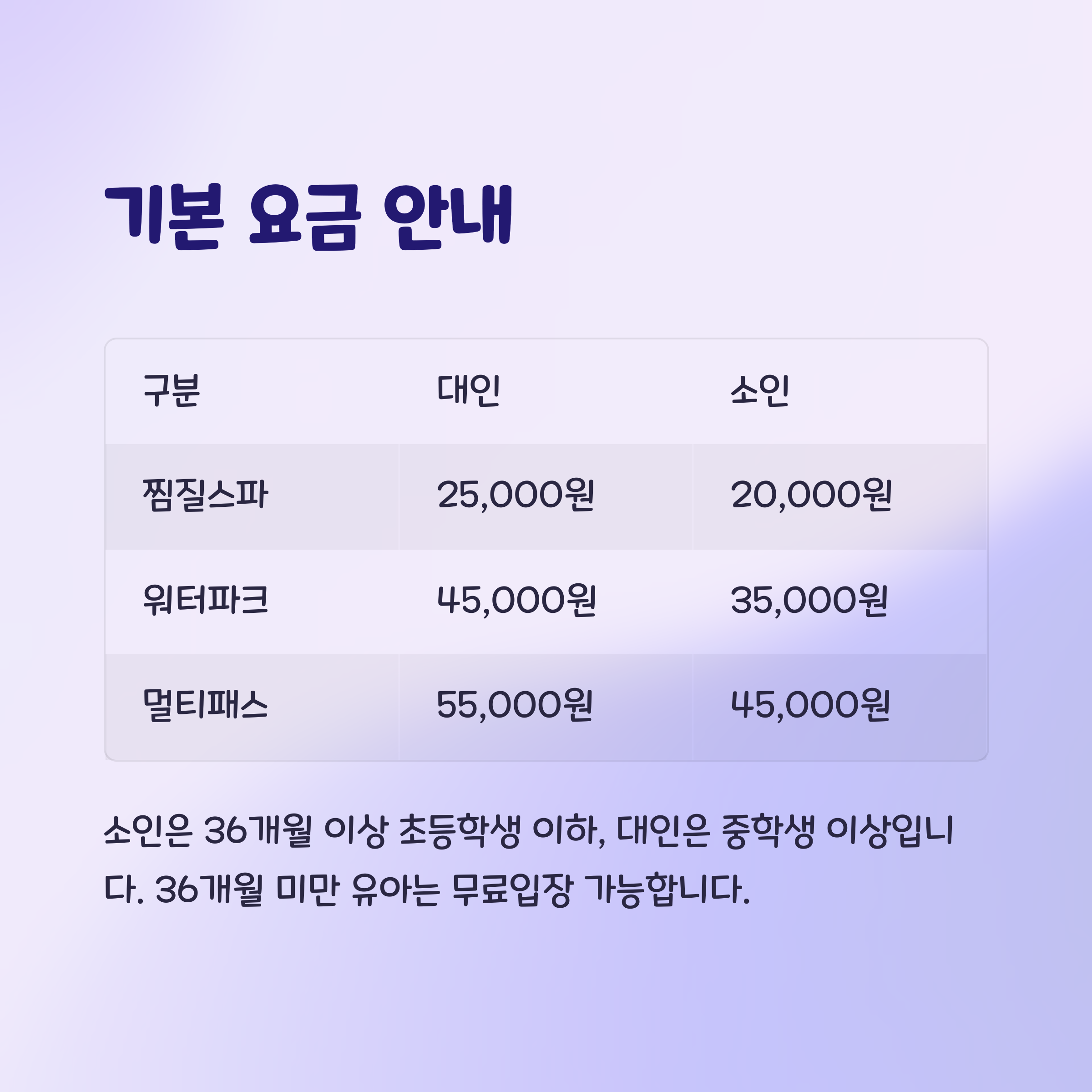소인은 36개월 이상 초등학생 이하, 대인은 중학생 이상이며, 36개월 미만 유아는 무료로 입장 가능하나 찜질복 및 타월은 제공되지 않습니다.