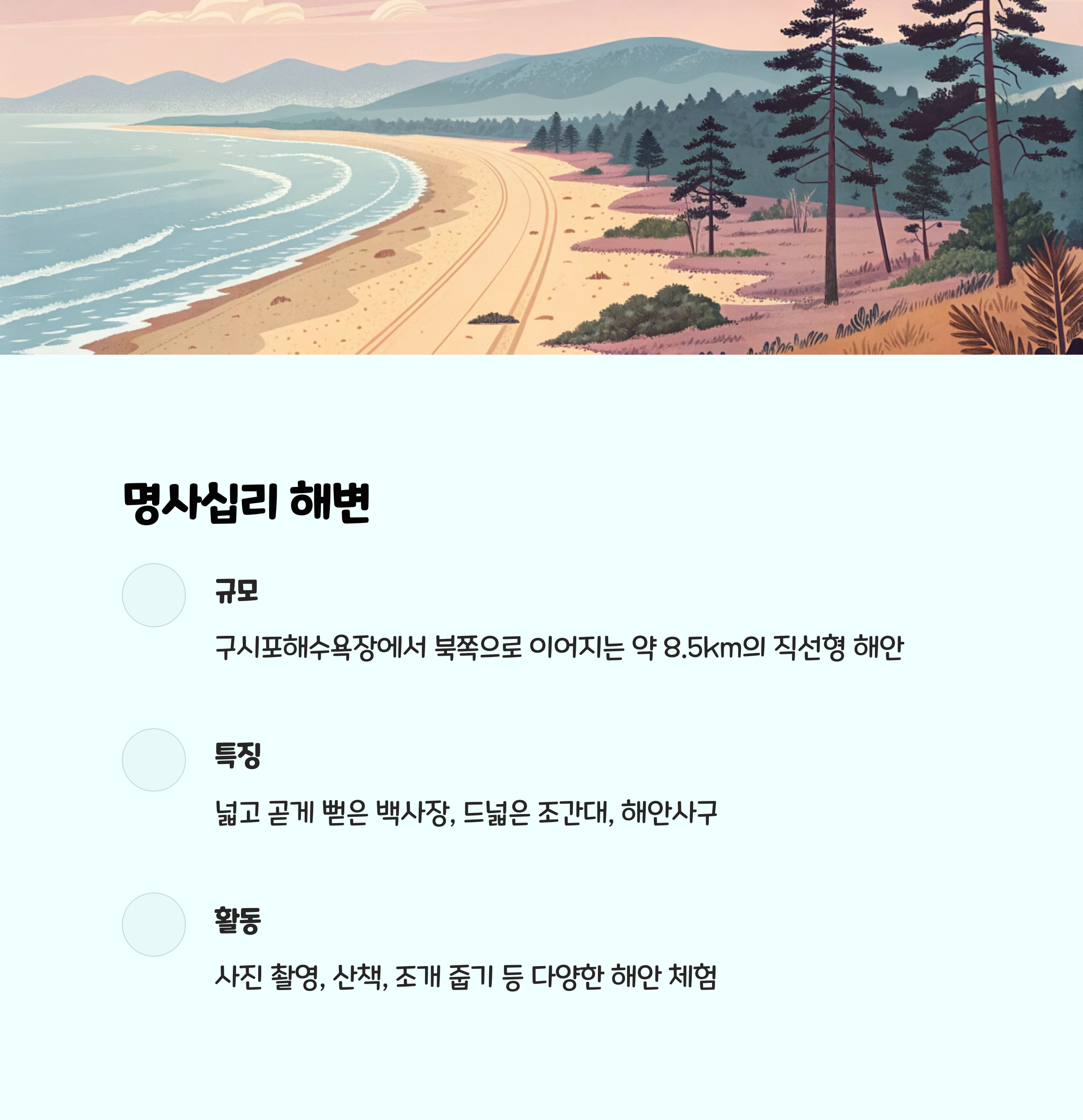 명사십리 해변은 사진 촬영, 산책, 조개 줍기 등 다양한 해안 체험이 가능하며, 고창의 자연미를 오롯이 느낄 수 있는 최고의 장소입니다.