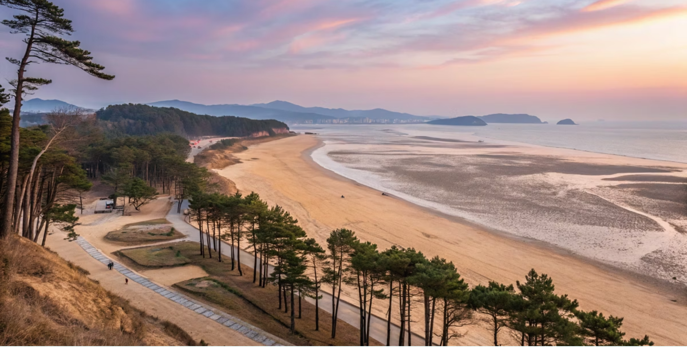 고창군 상하면에 위치한 구시포해수욕장은 길이 약 1.7km, 폭 2m의 넓고 고운 백사장을 자랑합니다. 완만한 경사와 안전한 수심으로 가족 단위 피서객들에게 특히 인기가 높습니다. 울창한 송림이 시원한 그늘을 제공하며, 남쪽에는 정유재란 당시 주민들이 피신했다는 천연동굴이 남아 있습니다.