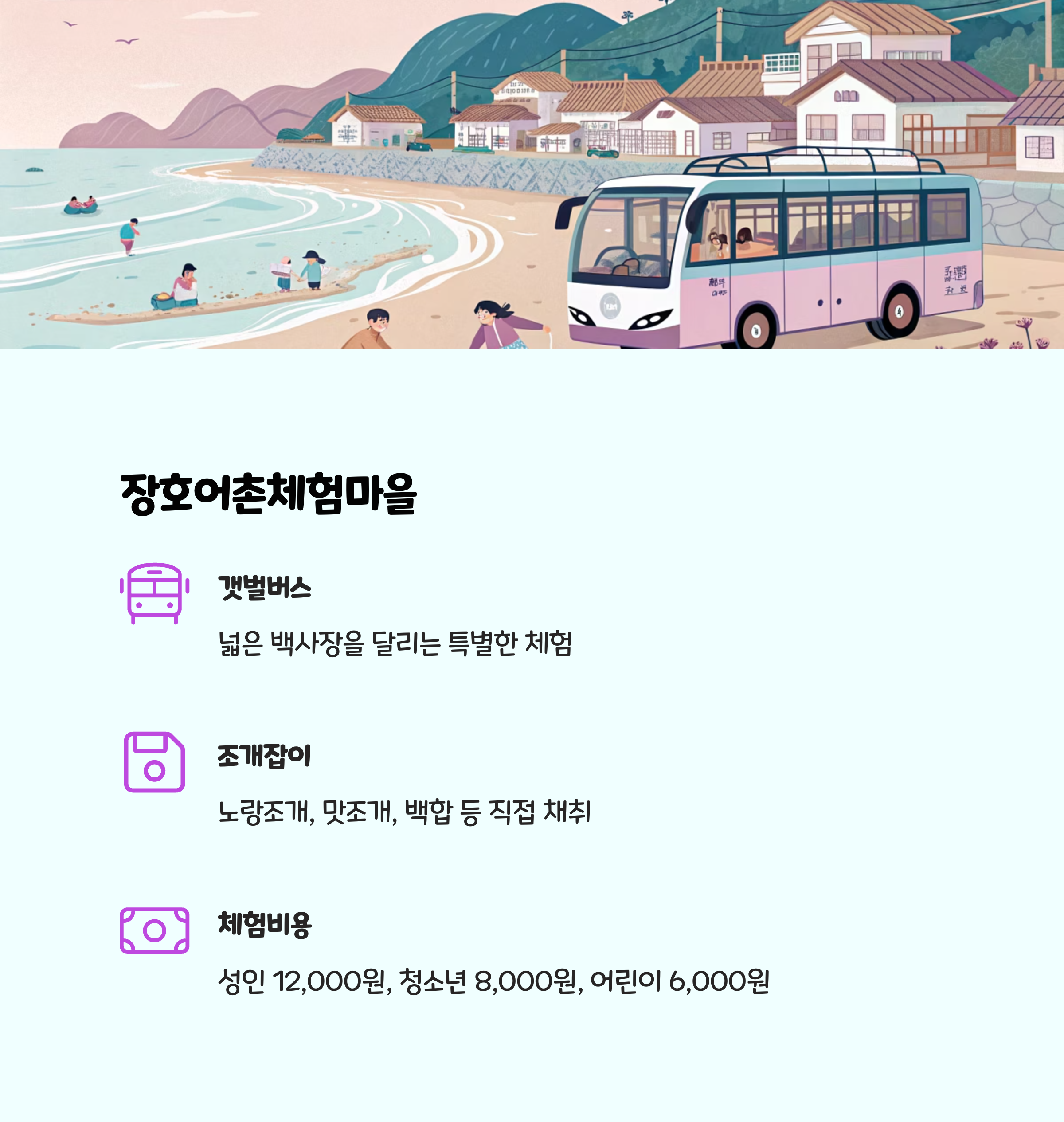 장호어촌체험마을의 주소는 전북 고창군 상하면 명사십리로 282-42입니다. 체험 비용은 개인 기준 성인 12,000원, 청소년 8,000원, 어린이 6,000원이며, 단체 방문 시 할인이 적용됩니다(성인 10,000원, 청소년 7,000원, 어린이 5,000원).
