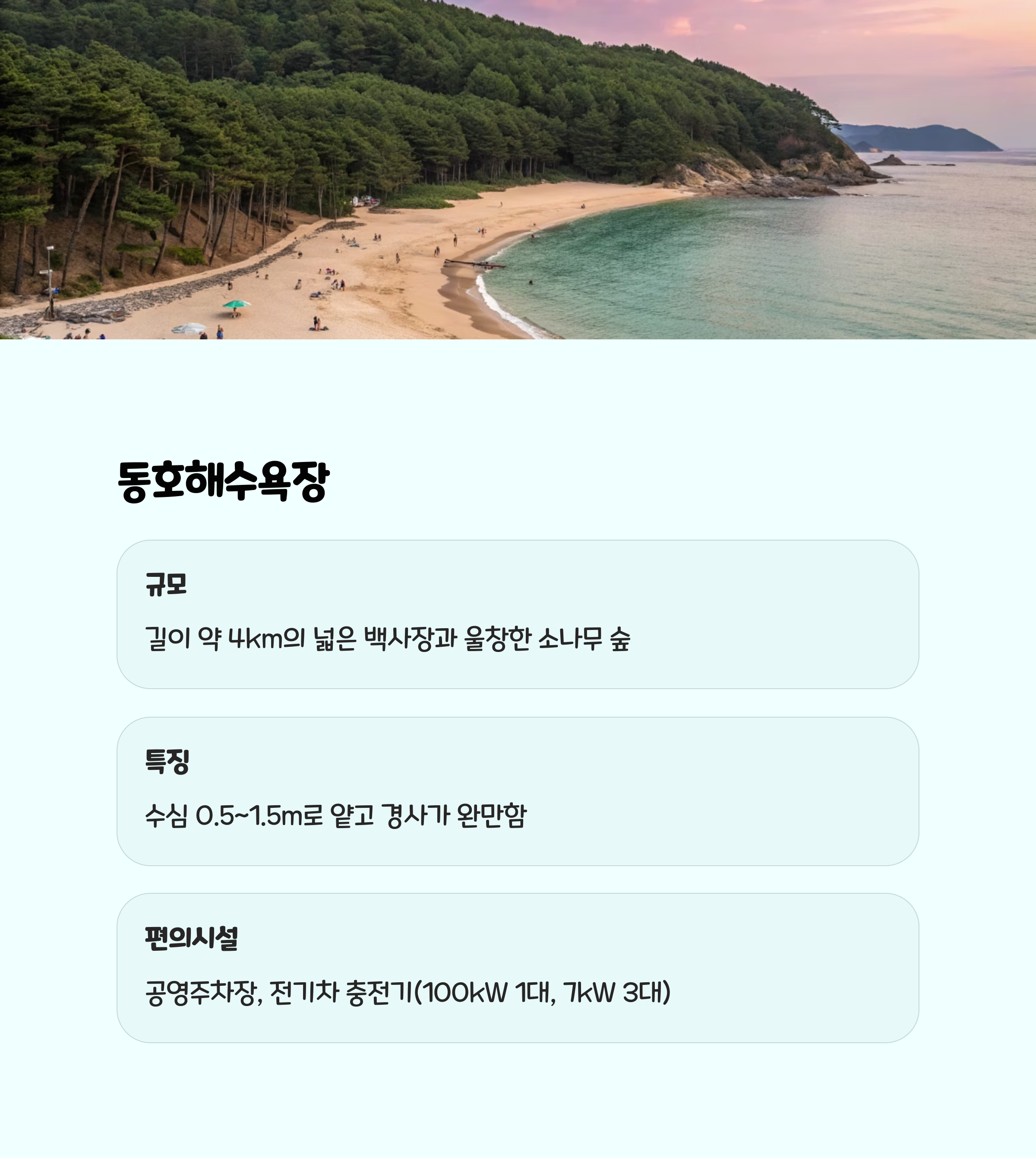 동호해수욕장 주소는 전북특별자치도 고창군 해리면 동호리 615-6이며, 공영주차장에 100kW 1대, 7kW 3대의 전기차 충전기가 설치되어 있어 편리한 방문이 가능합니다.