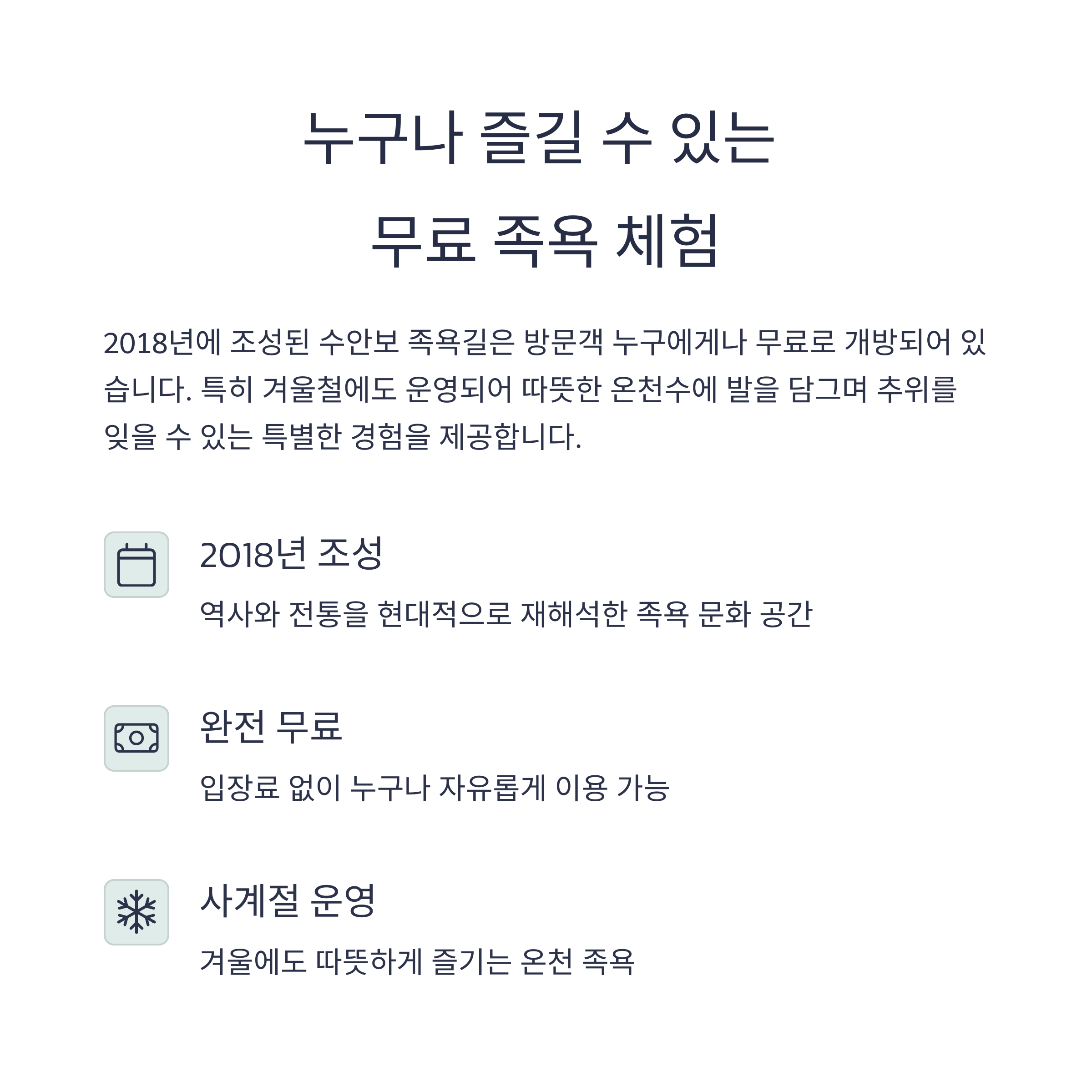 | 무료 족욕 체험 | 월, 화 제외 무료 운영, 주말 2곳 운영 |