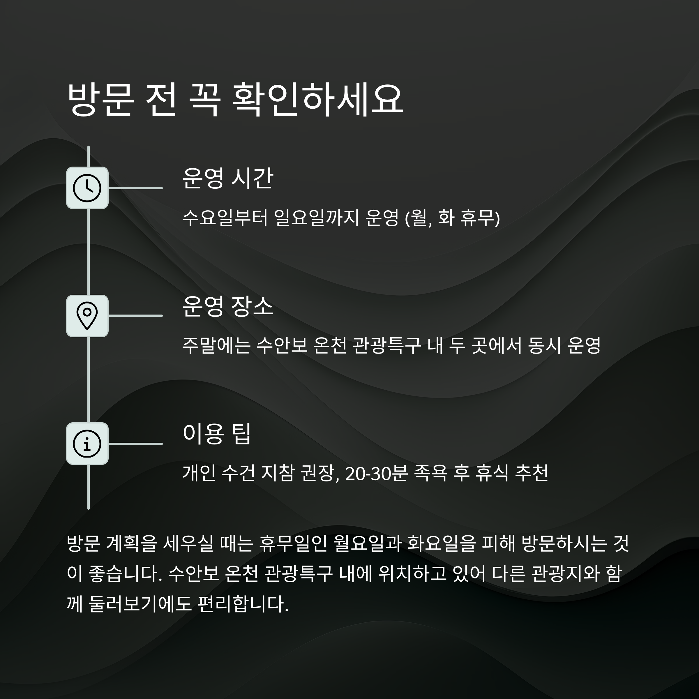 월요일과 화요일을 제외한 수요일부터 일요일까지 이용 가능하며 주말에는 더욱 활발한 운영이 이루어집니다. 따뜻한 온천수에 발을 담그며 힐링과 함께 스트레스를 해소할 수 있는 특별한 경험을 제공합니다.
