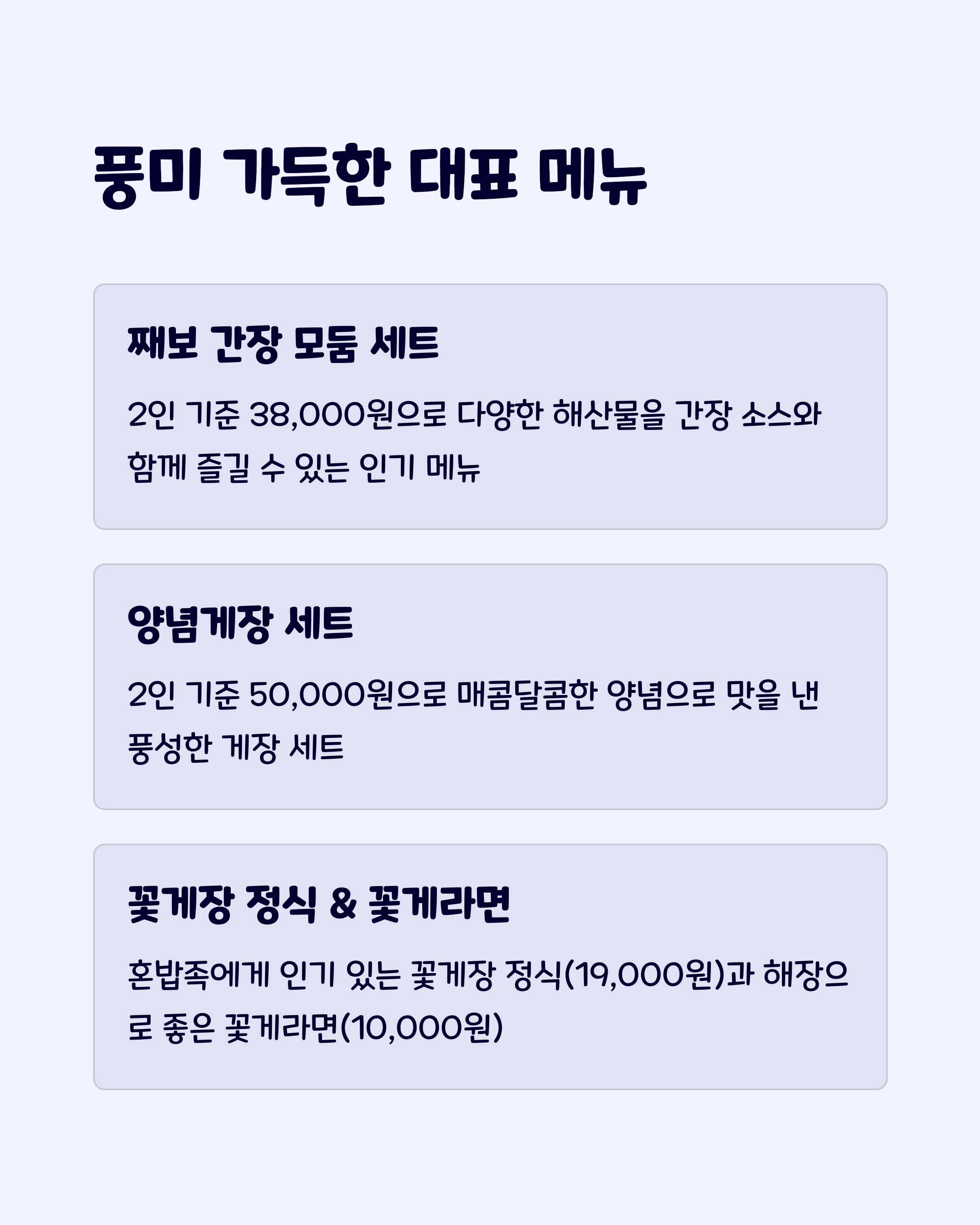 대표 메뉴는 모둠장 세트와 양념게장입니다. 해산물 본연의 맛과 비법 간장이 어우러진 구성으로 꾸준히 사랑받고 있습니다.