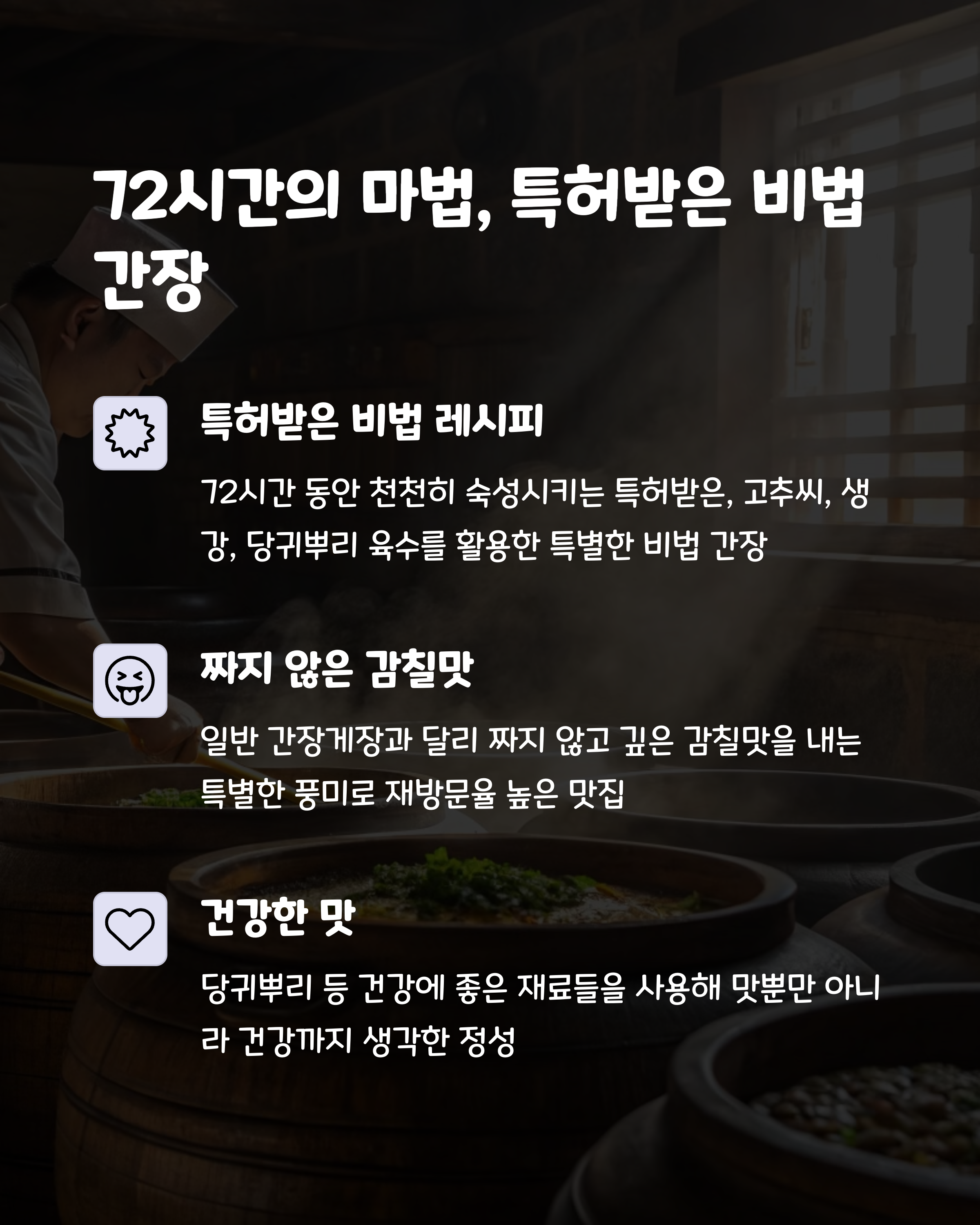째보식당의 간장은 72시간 숙성된 특허받은 비법 간장으로 만들어지며,