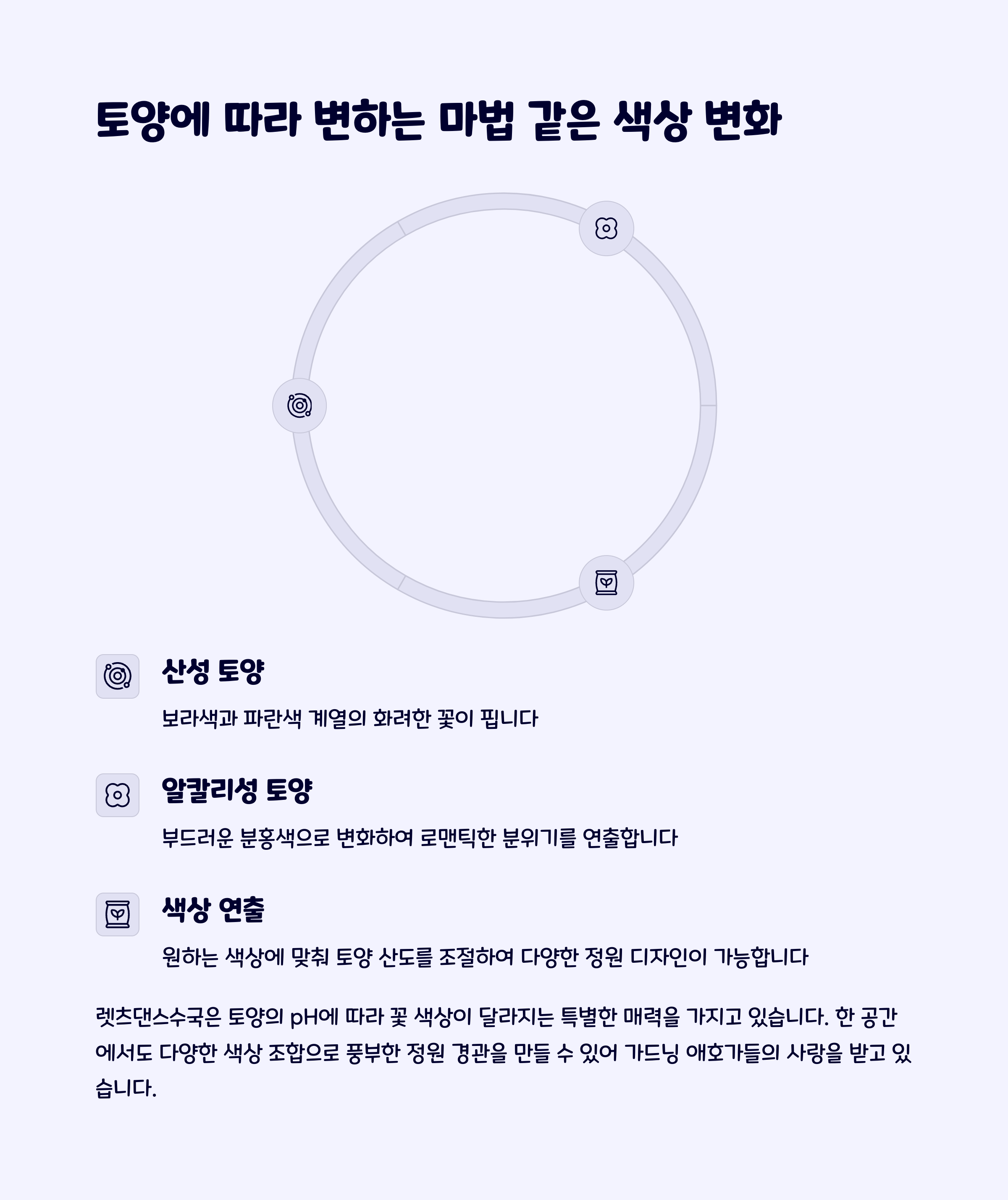 산성 토양 (pH 5.5 이하): 라벤더, 보라, 푸른색