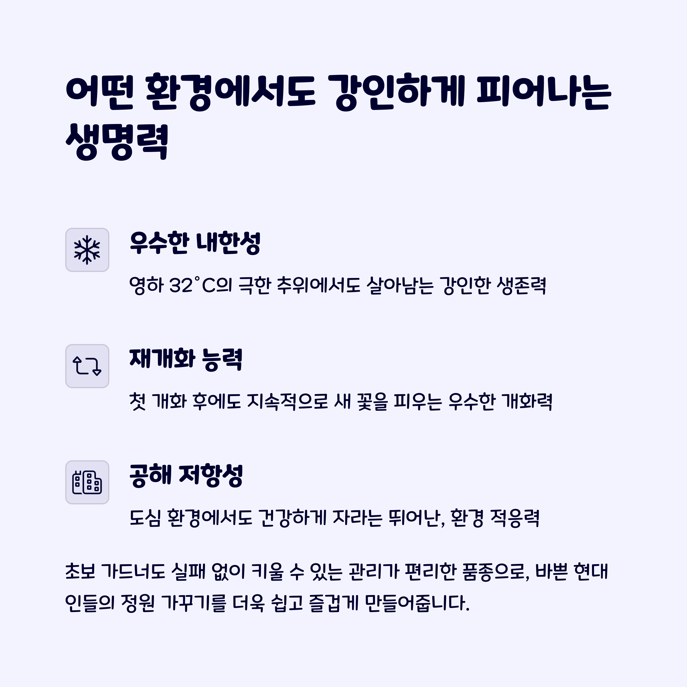 월동: -32도까지 견디지만, 뿌리 보호를 위해 멀칭을 추천합니다.