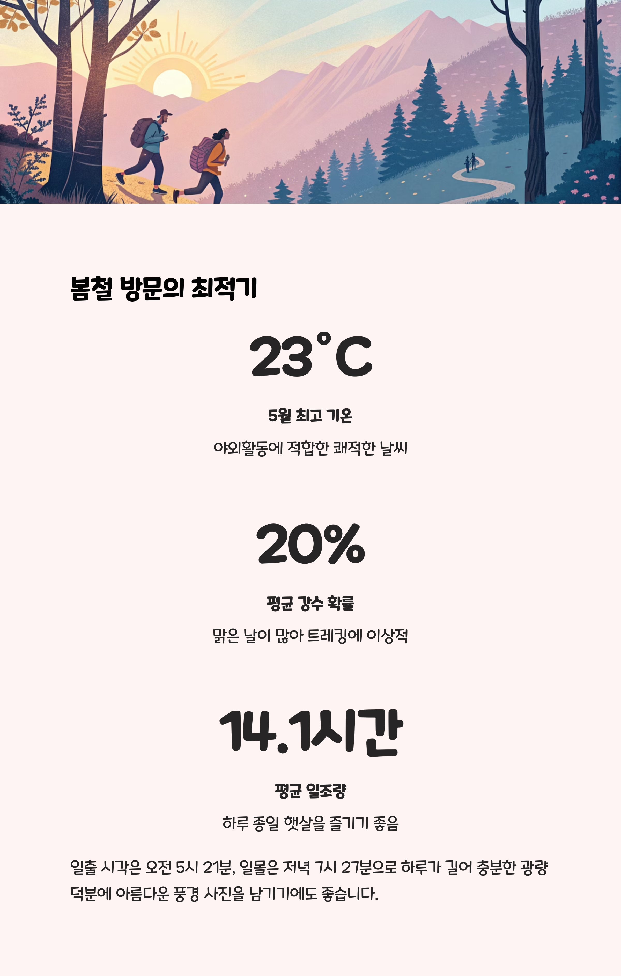 일출 시각은 오전 5시 21분, 일몰은 저녁 7시 27분으로 하루가 긴 봄날의 특성을 잘 살릴 수 있으며, 충분한 광량 덕분에 아름다운 풍경 사진을 남기기에도 좋습니다.