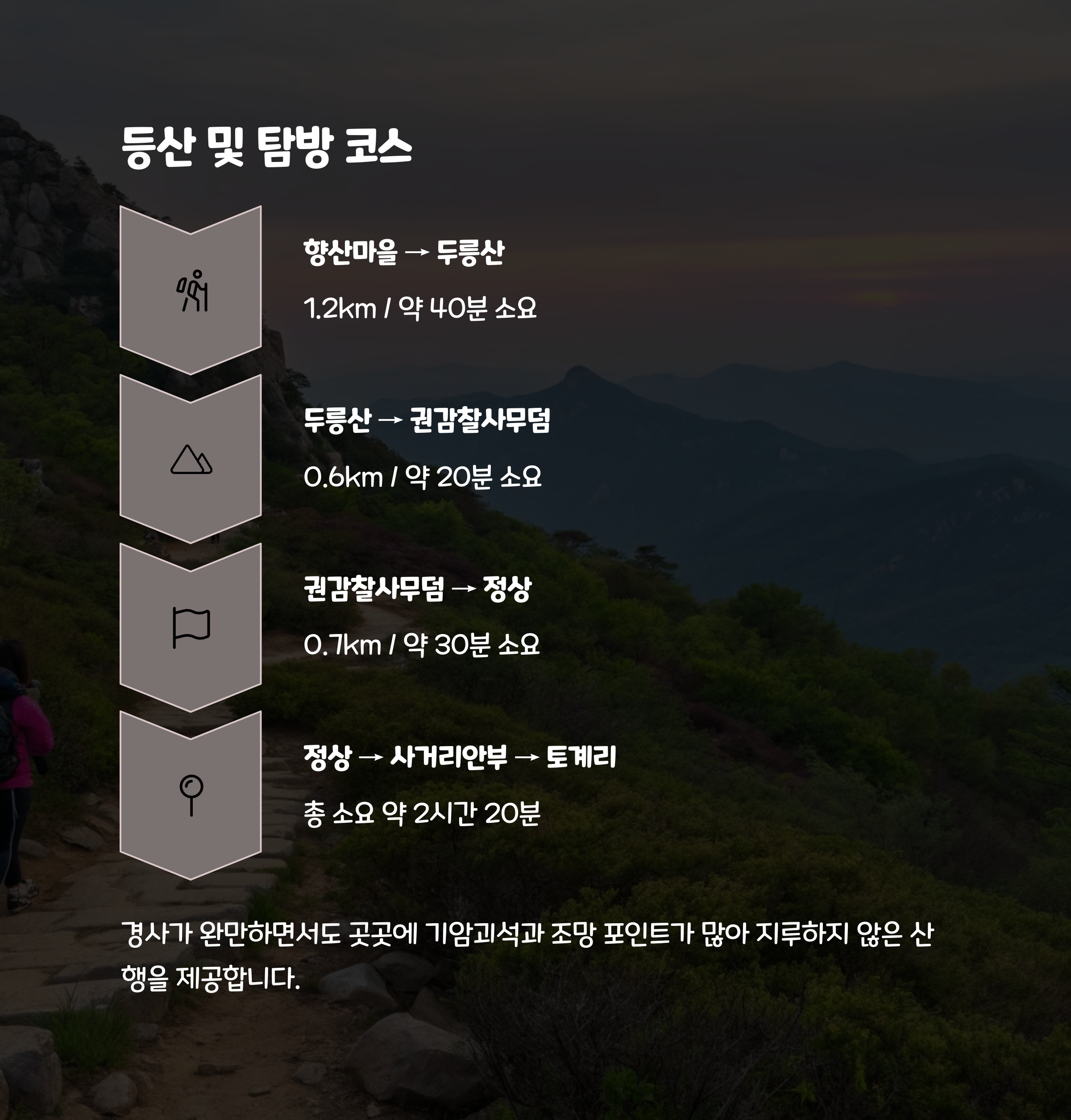 본격적인 등산 코스는 향산마을에서 시작하여 다음과 같은 경로를 따라가게 됩니다: