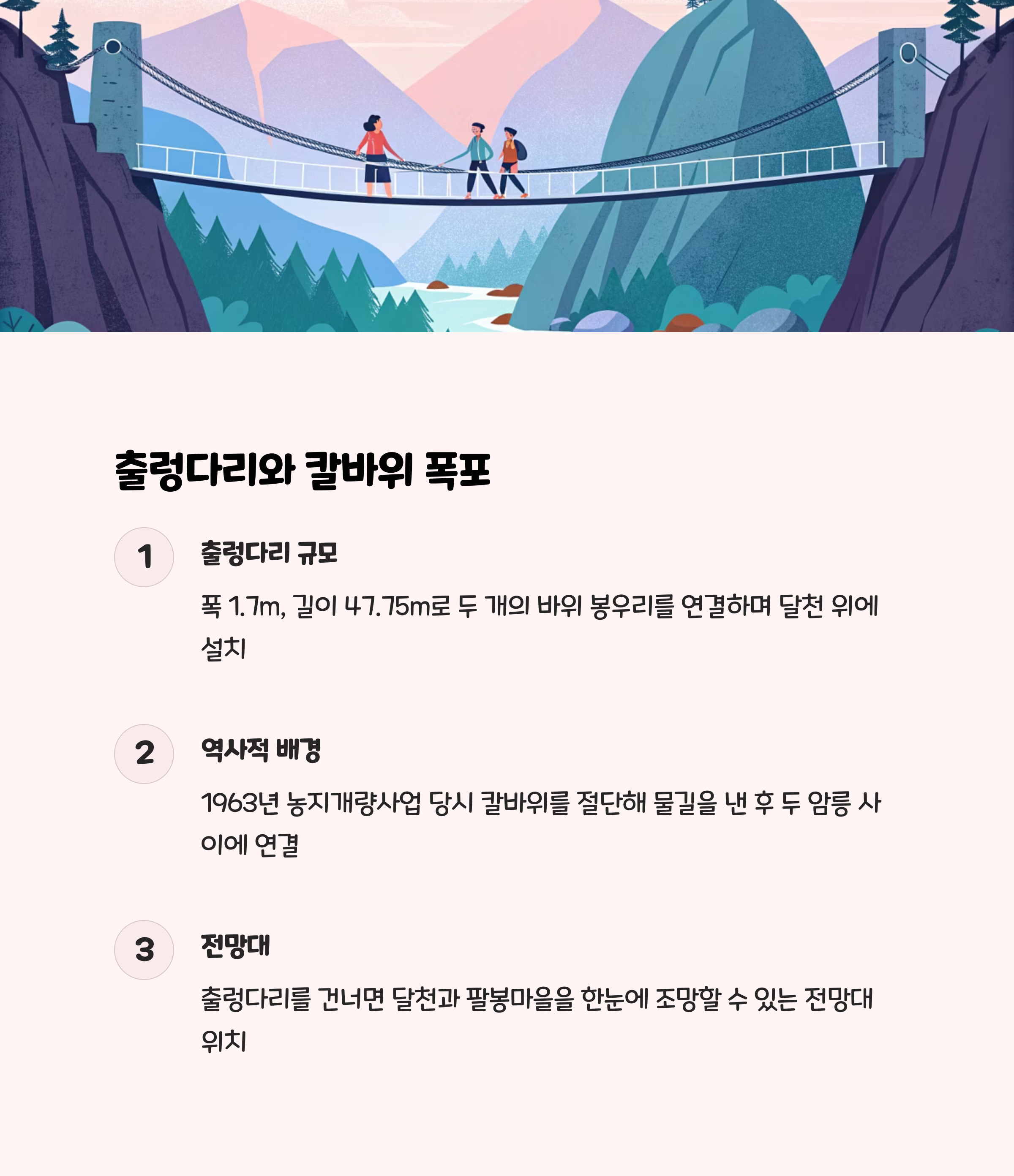 수주팔봉을 대표하는 포토존이라 할 수 있는 출렁다리는 폭 1.7m, 길이 47.75m의 다리로, 두 개의 바위 봉우리를 연결하며 달천 위에 아슬아슬하게 설치되어 있습니다. 규모는 작지만 위치와 조화로움에서 오는 장관은 방문객의 감탄을 자아냅니다.
