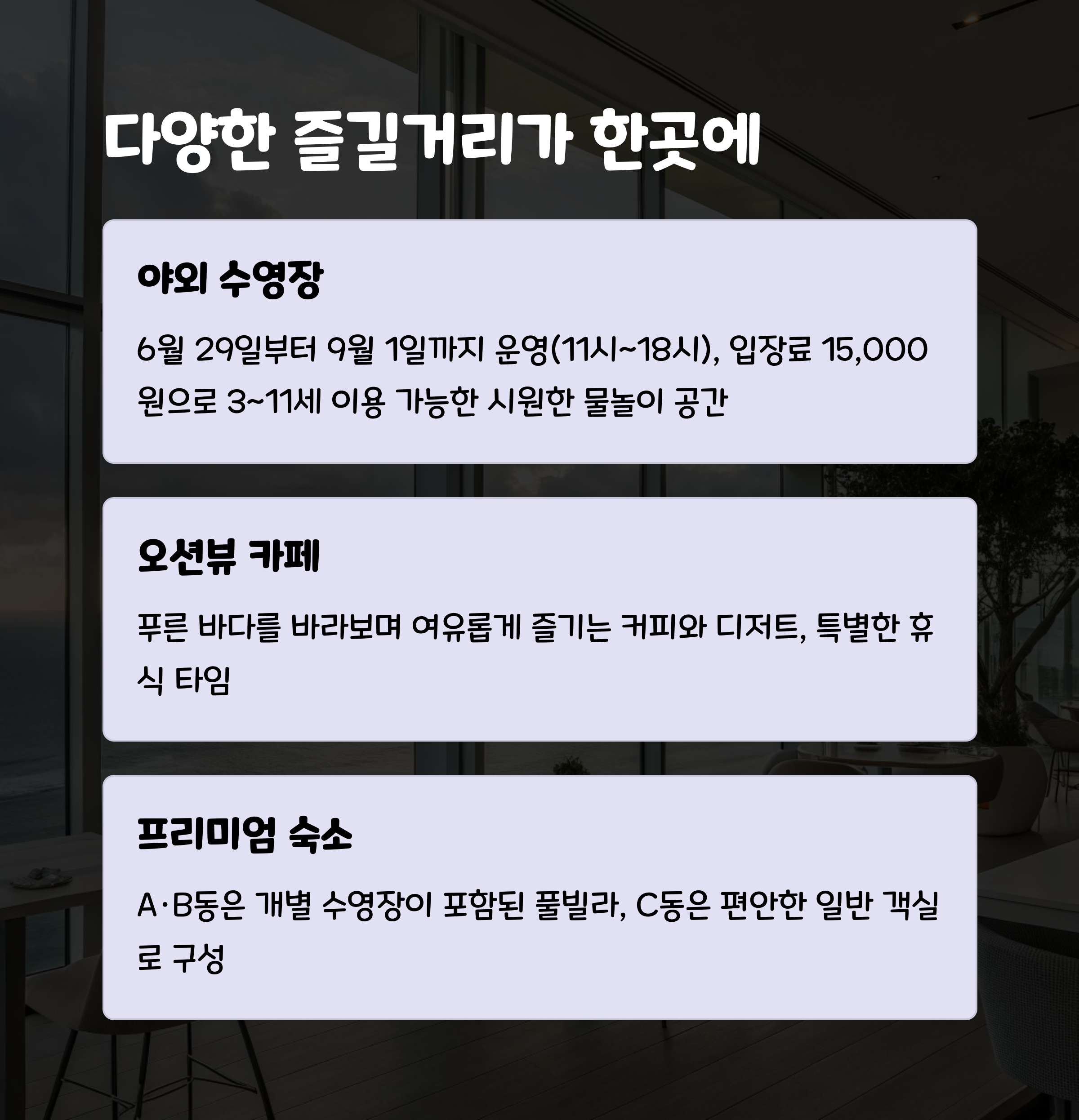 총 3개 동(A동, B동, C동)으로 구성되어 있으며, 카페, 야외 수영장, 숙박시설이 결합된 구조입니다.