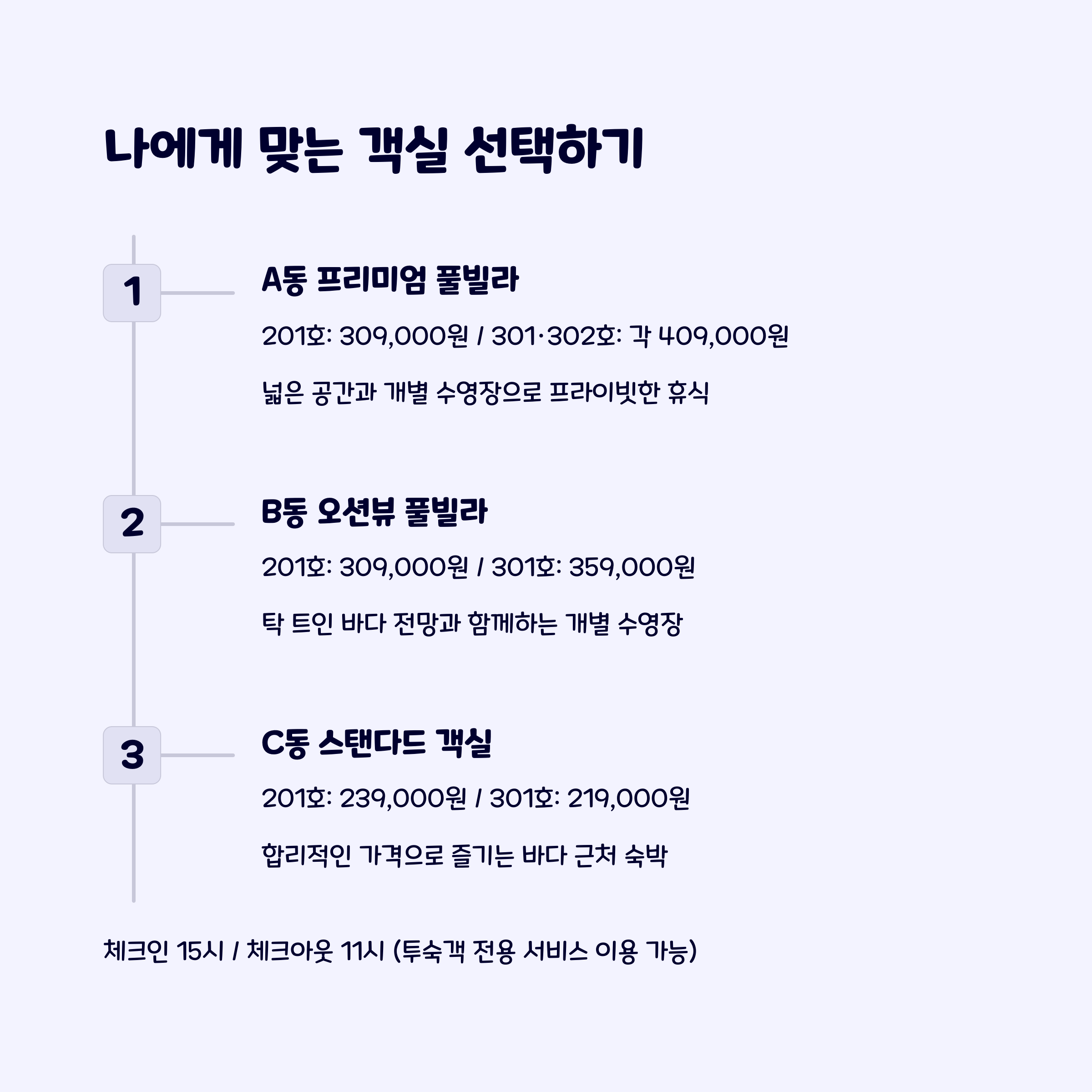 - 201호: 2인 기준, 최대 4인 / 309,000원 (26% 할인)