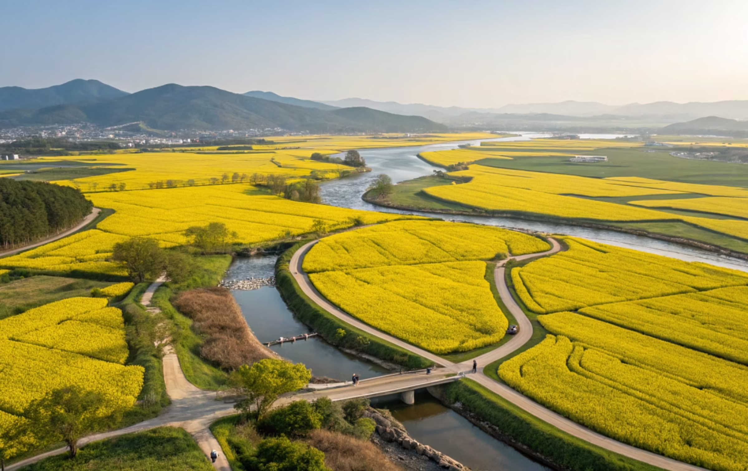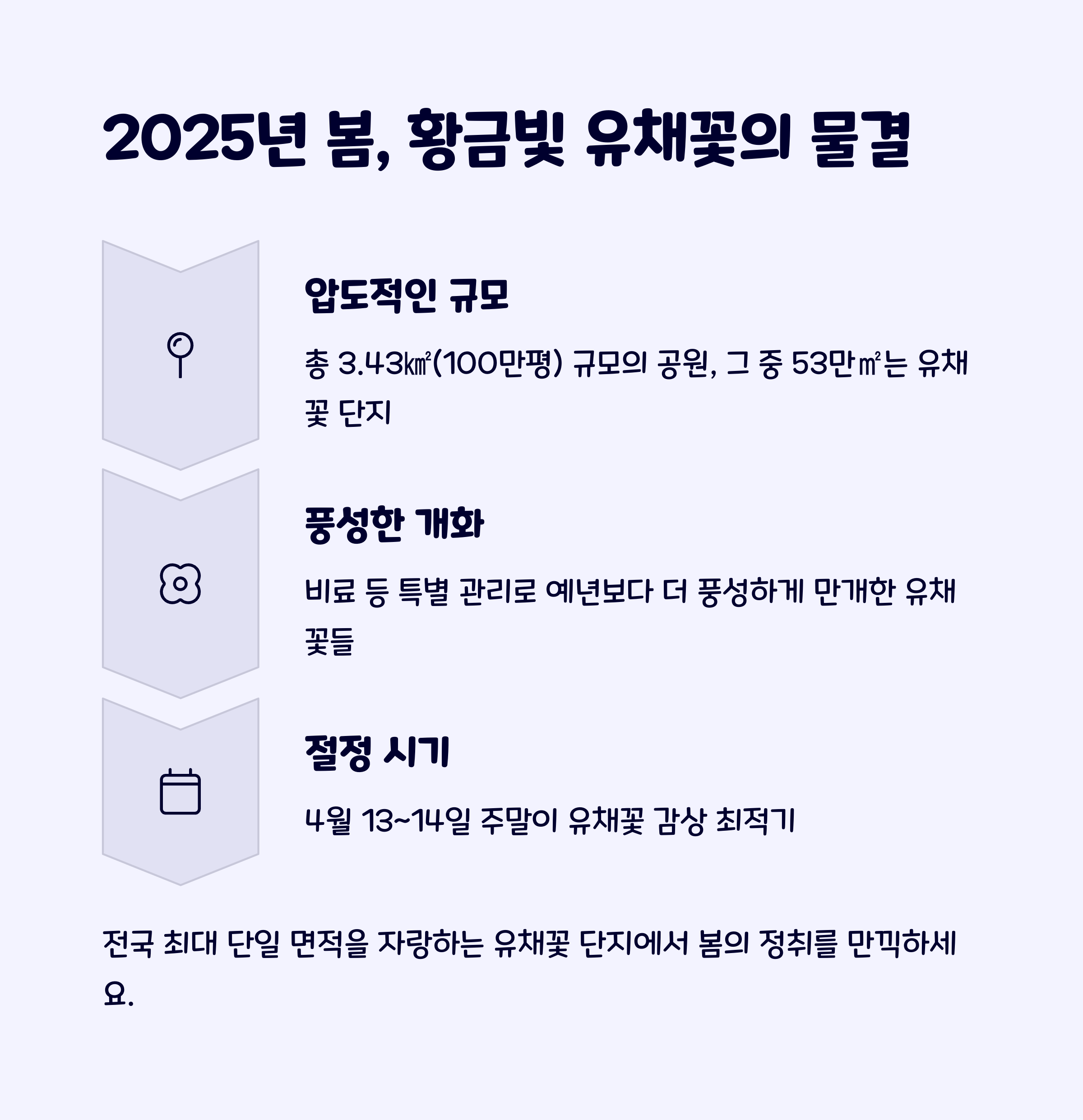 이 중에서도 53만㎡ 규모의 유채꽃 단지는 전국 최대 규모로, 지금 이 시기(4월 중순)에 절정을 이루며 장관을 펼치고 있습니다.