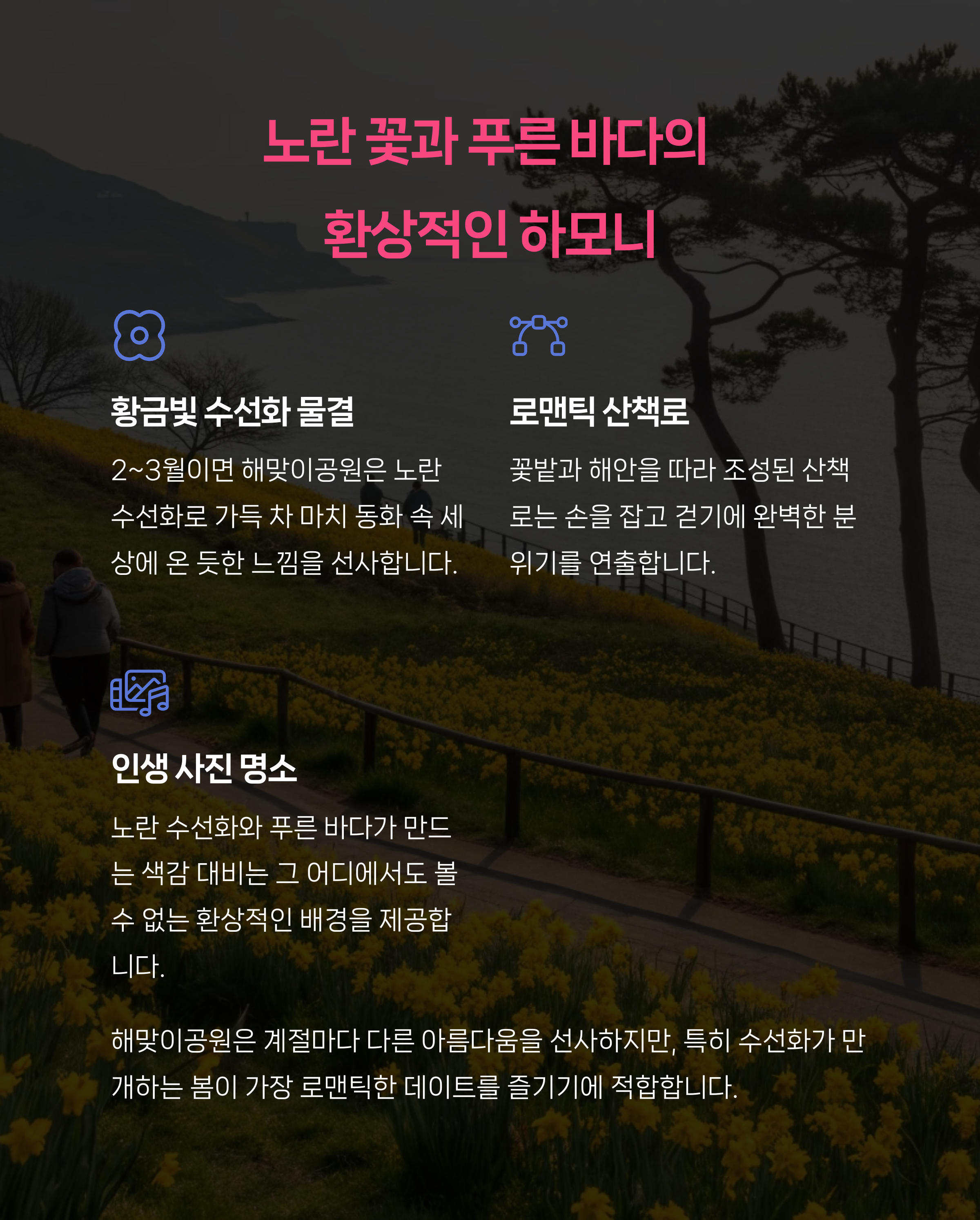 부산은 다양한 매력을 지닌 도시로 계절마다 다른 풍경과 특별한 경험을 제공합니다. 특히 오륙도 스카이워크와 해맞이공원의 수선화는 자연과 로맨스가 어우러진 이색적인 데이트 장소로 많은 커플들에게 추천되고 있습니다.