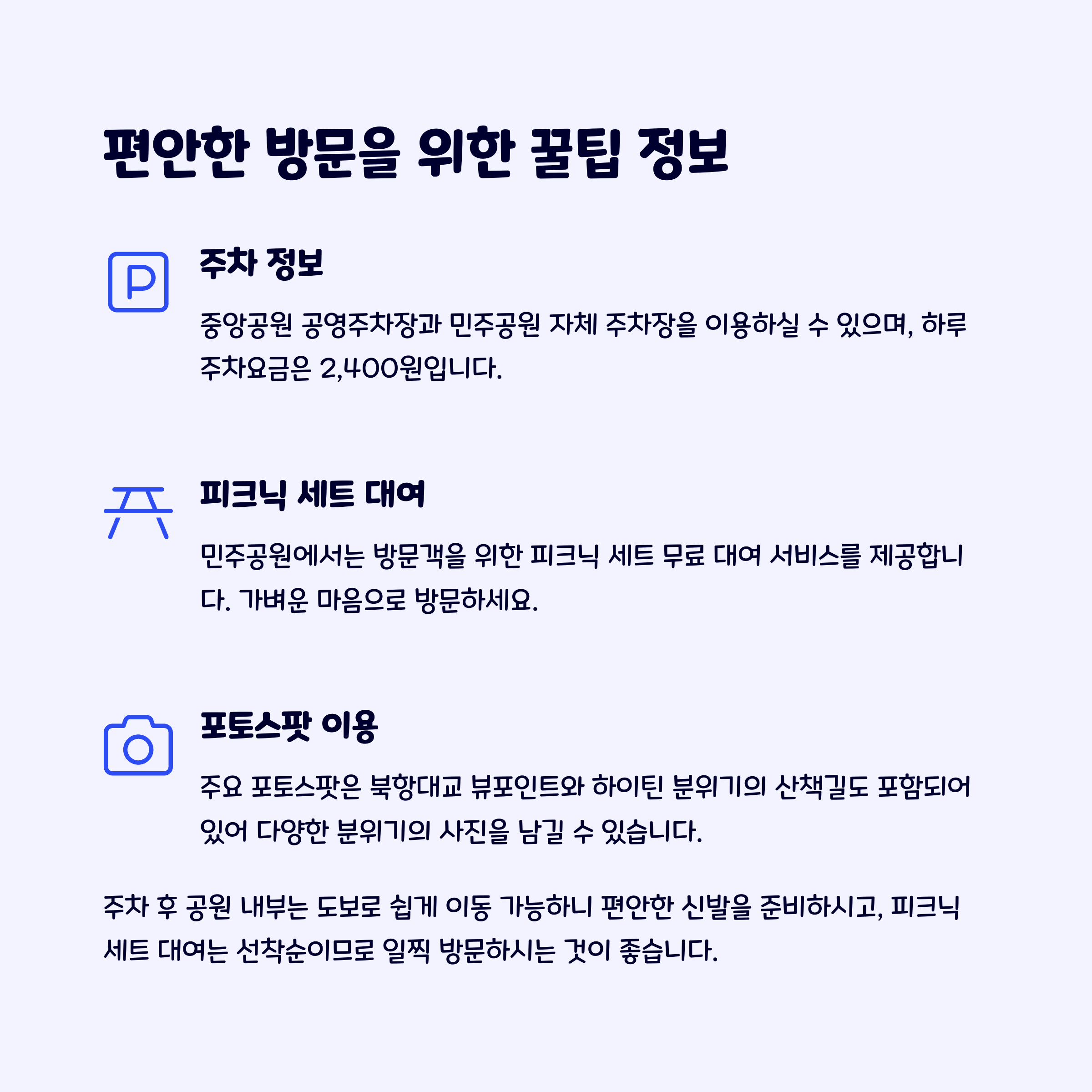 주차 : 중앙공원 공영주차장 추천 (1일 2,400원), 민주공원 주차장은 협소함
