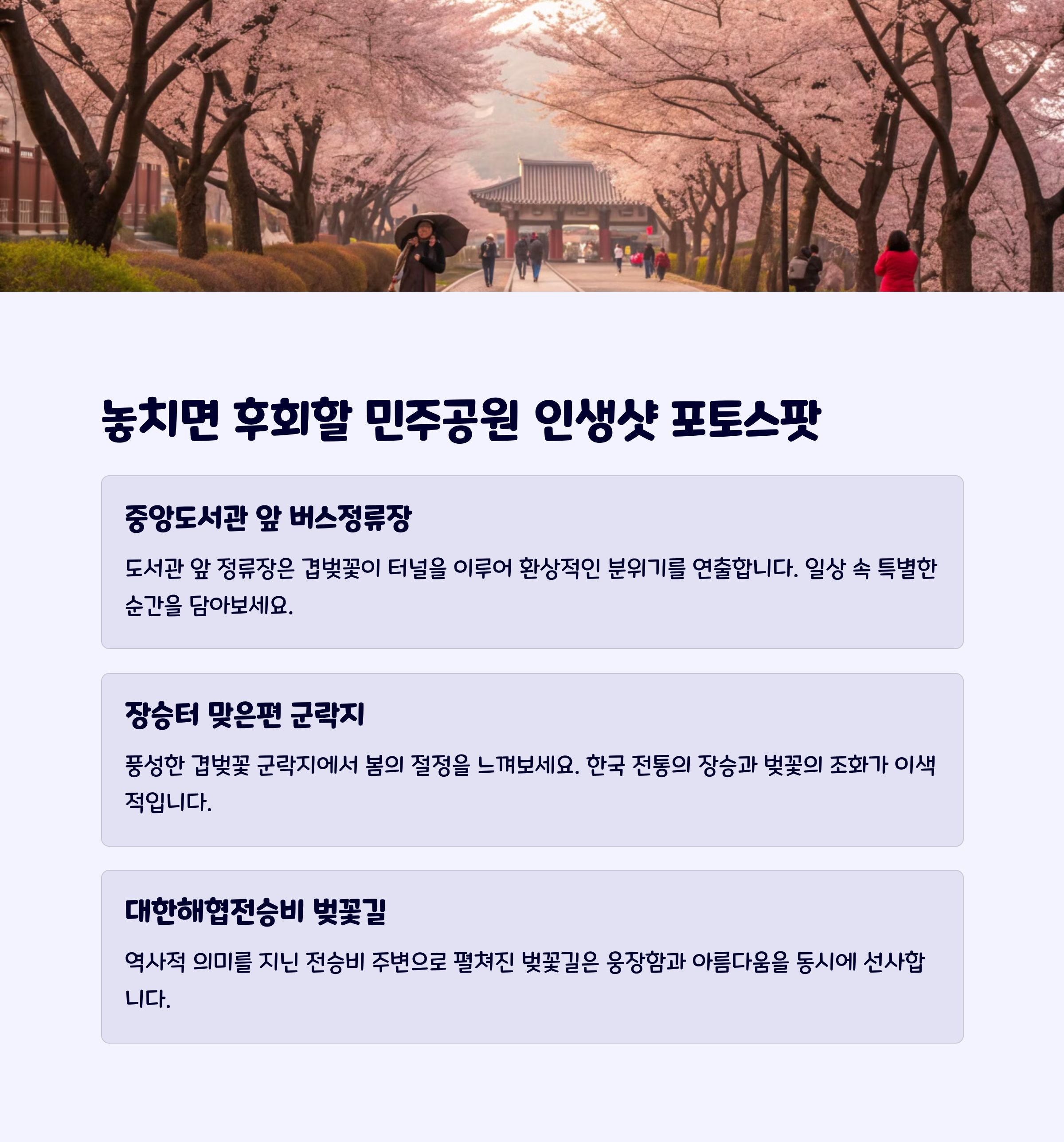 A: 민주공원은 다양한 겹벚꽃 포토스팟과 함께 역사와 자연이 어우러진 최고의 명소입니다.