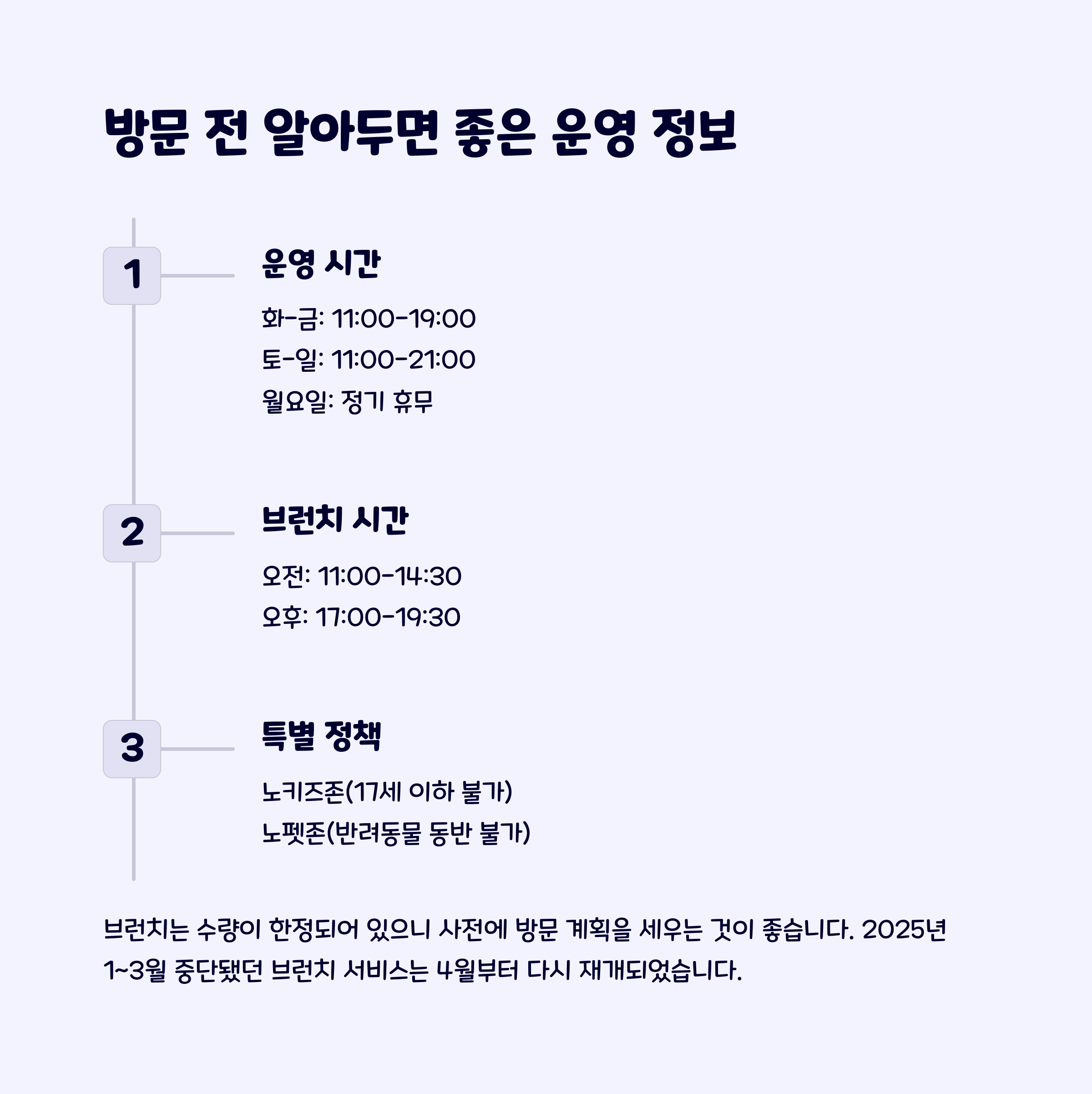 2025년 초 건강상 문제로 브런치 운영이 중단되었으나, 현재는 브런치 재개되어 매일 다양한 파스타를 즐길 수 있습니다.