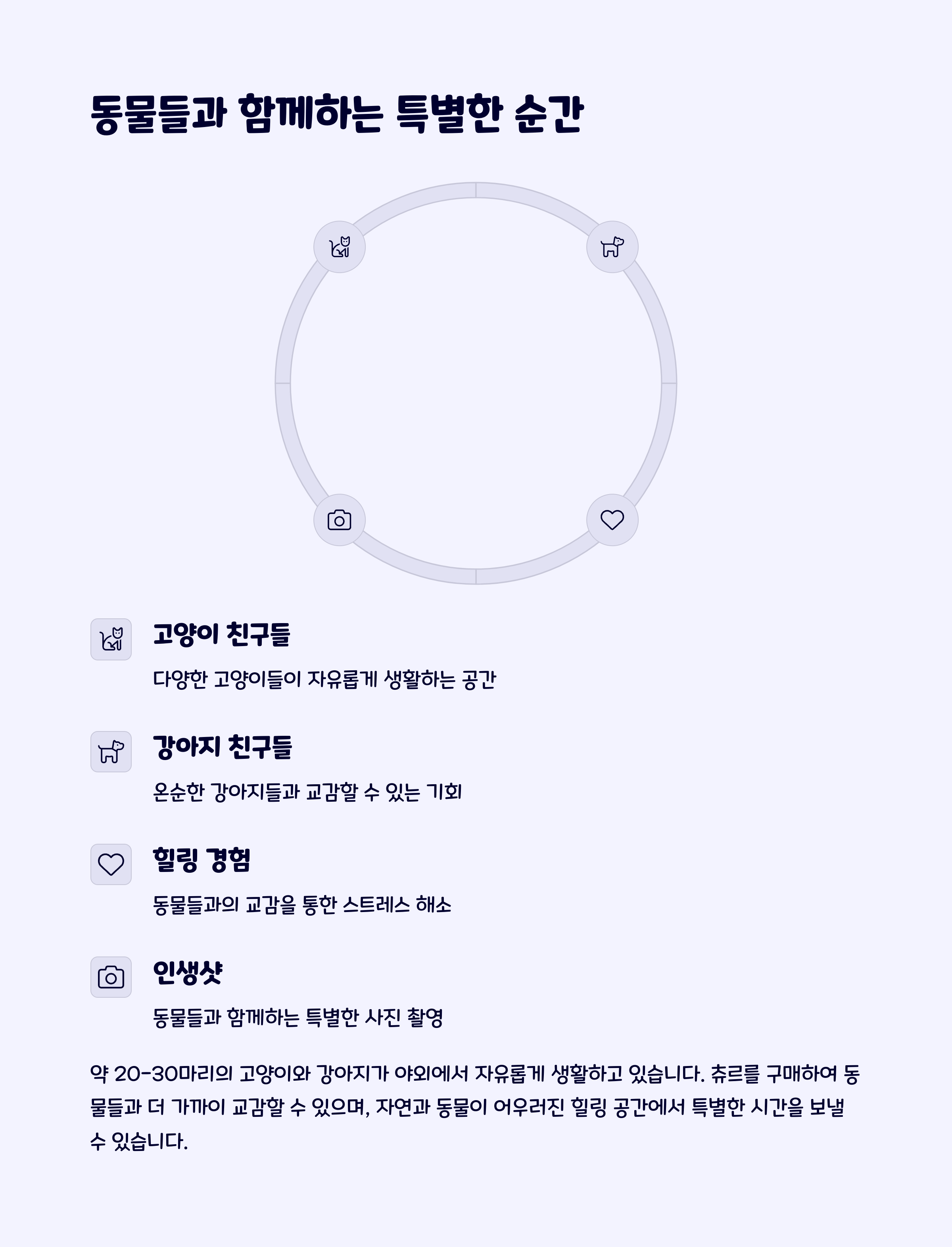 넓은 야외 정원에는 고양이와 강아지들이 자유롭게 돌아다니며, 손님들과 자연스럽게 교감하는 모습이 인상적입니다.