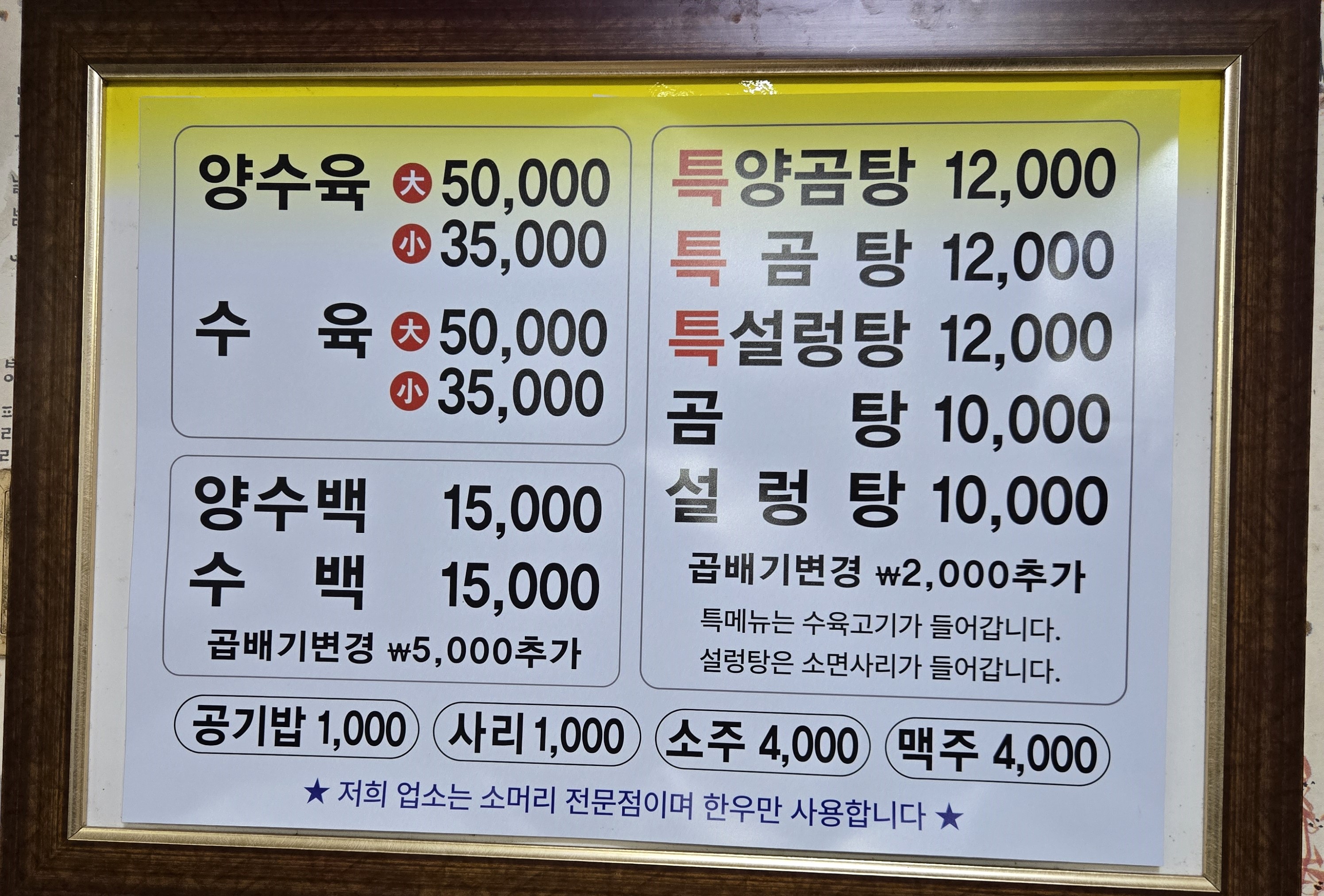 | 대표 메뉴와 특징 | 곰탕, 수백, 양수백 등 수육 중심의 전통 한식 |