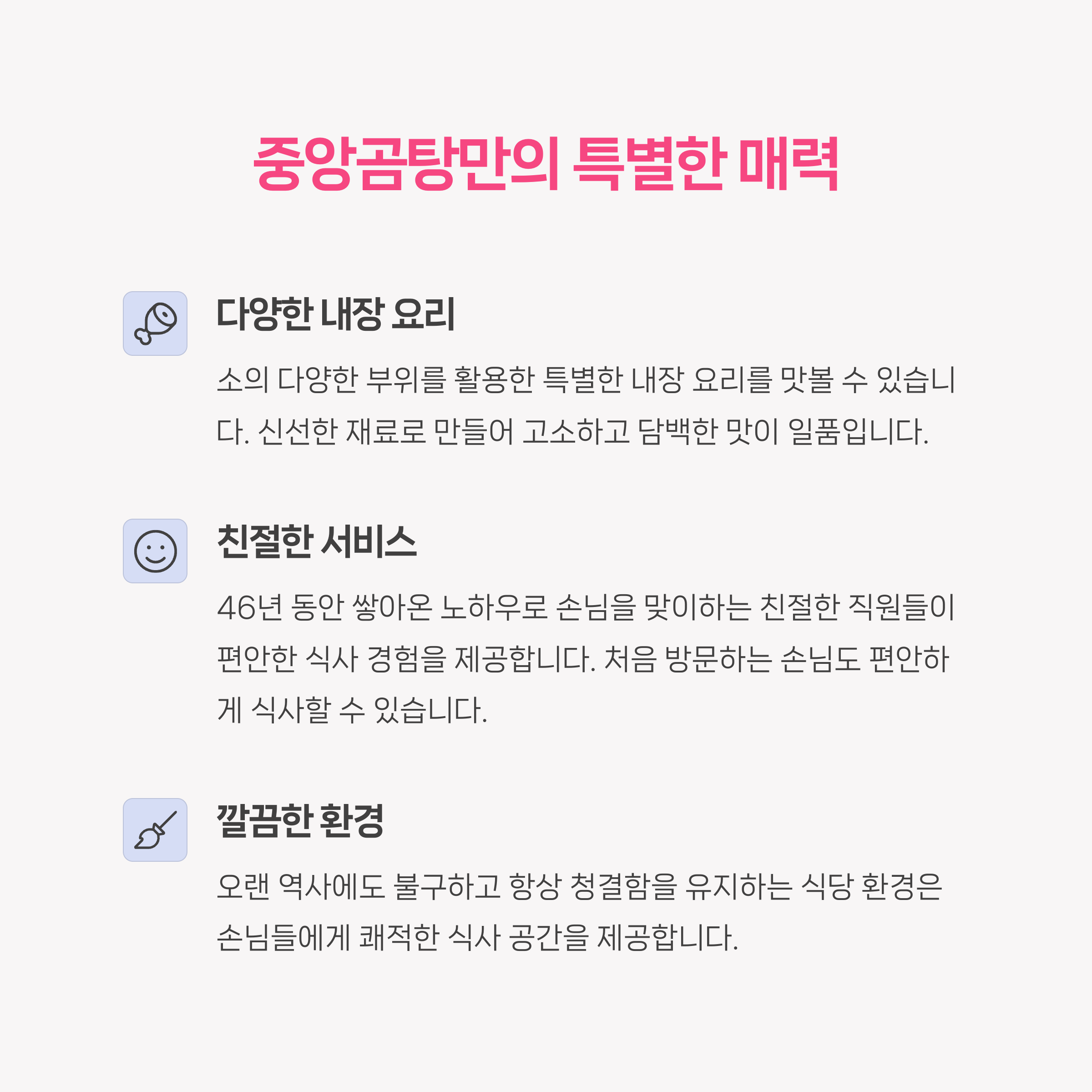 특히 부드러운 수육과 진한 곰탕 국물은 입맛을 까다롭게 타는 사람들에게도 큰 만족을 선사하며 친절한 응대와 깔끔한 실내 환경 또한 방문객의 만족도를 높여줍니다.