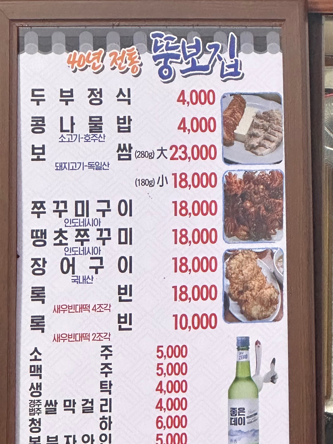 | 대표 메뉴 | 쭈꾸미구이, 보쌈, 록빈(새우빈대떡) |