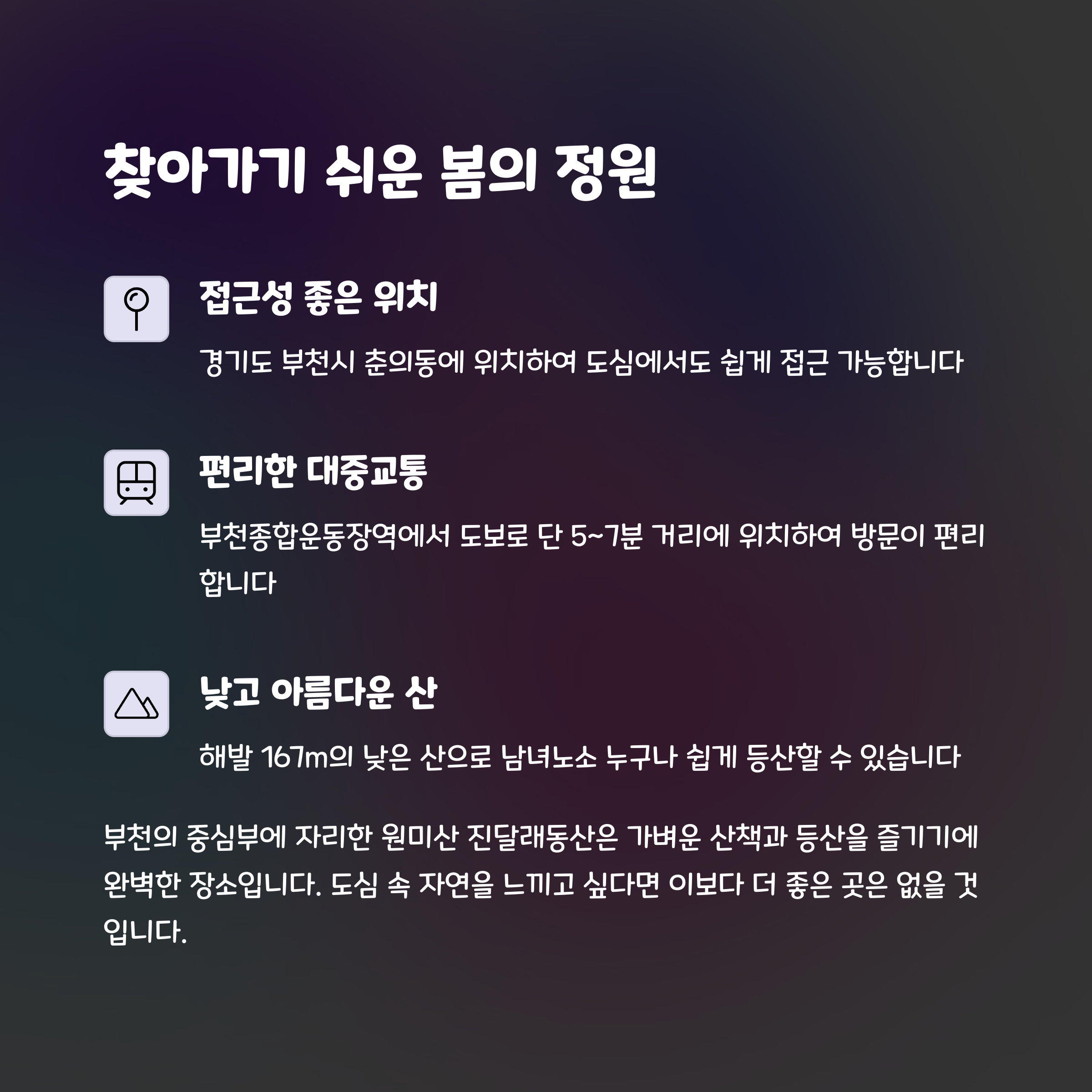 오늘은 부천 원미산 진달래동산의 아름다움을 사진으로 담을 수 있는 포토존을 소개하겠습니다.