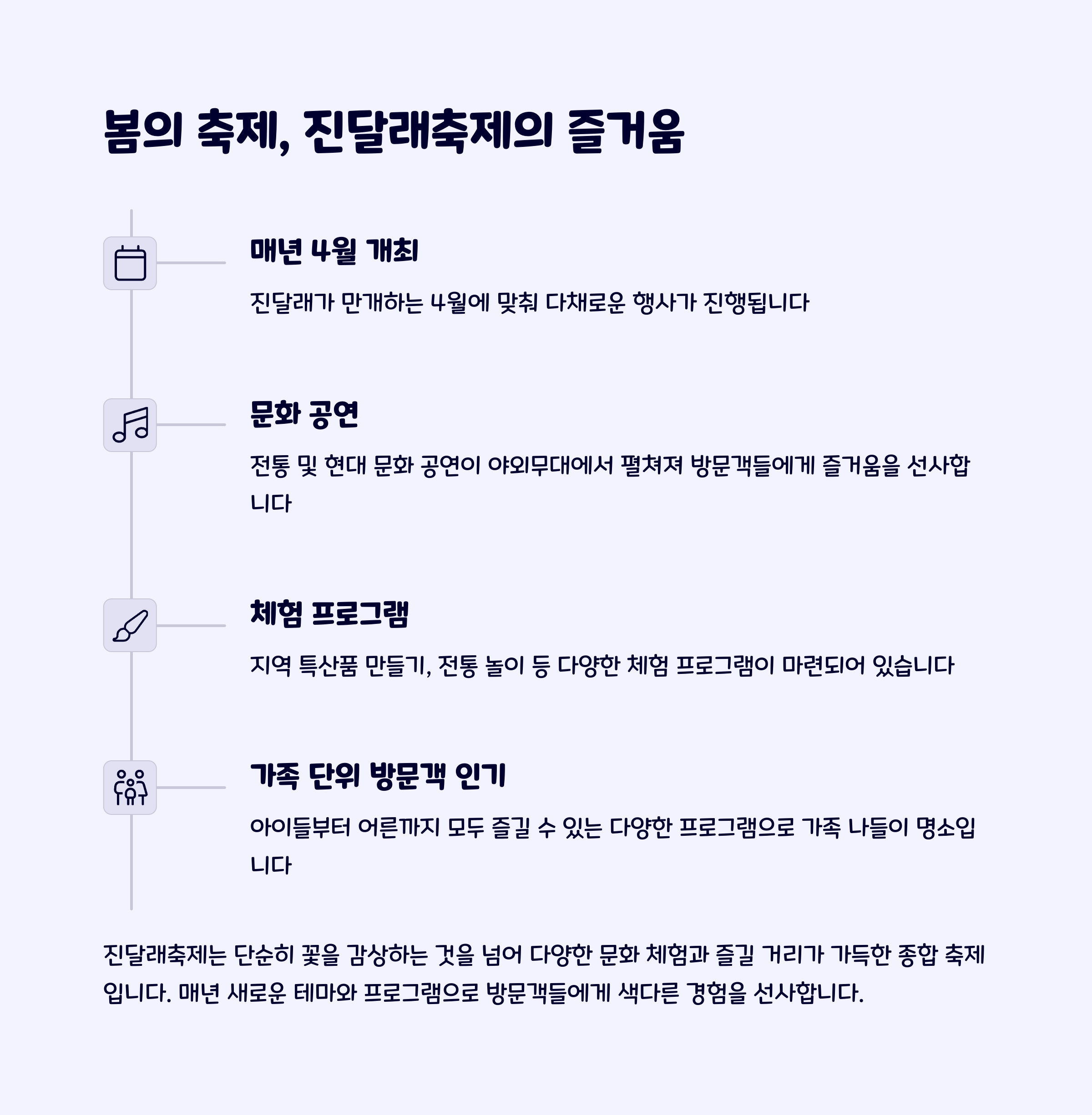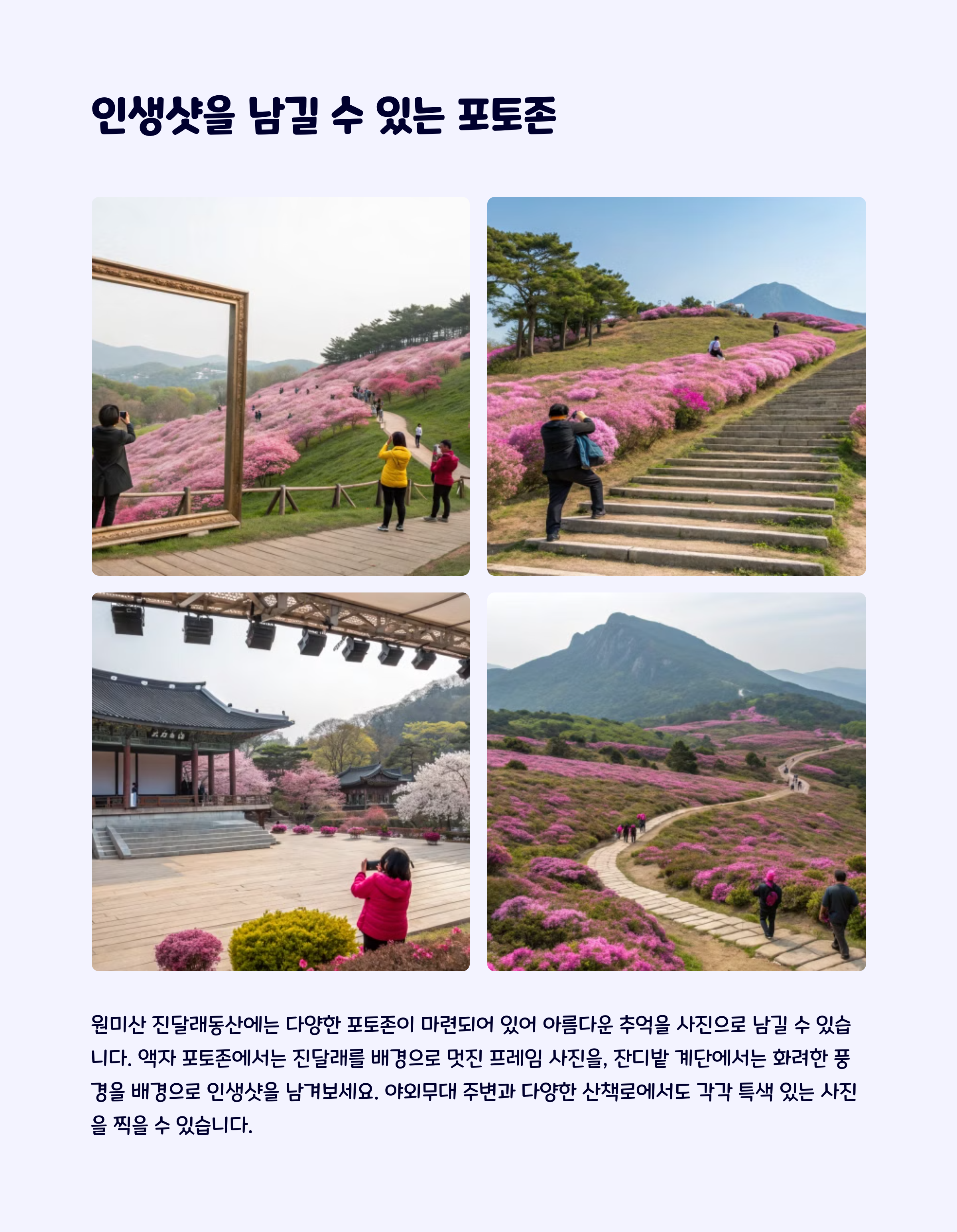 | 전망대와 진달래 언덕이 주요 스팟입니다. 전망대는 확 트인 경치를 제공하여 아침 일출 때 인기가 많습니다. 진달래 언덕에서는 꽃밭과의 조화로운 촬영이 가능합니다. 포토존 각각은 그 자체로 특별한 매력을 지니고 있습니다. 두 공간 모두 특색 있는 사진을 담기에 최적의 장소입니다. |
