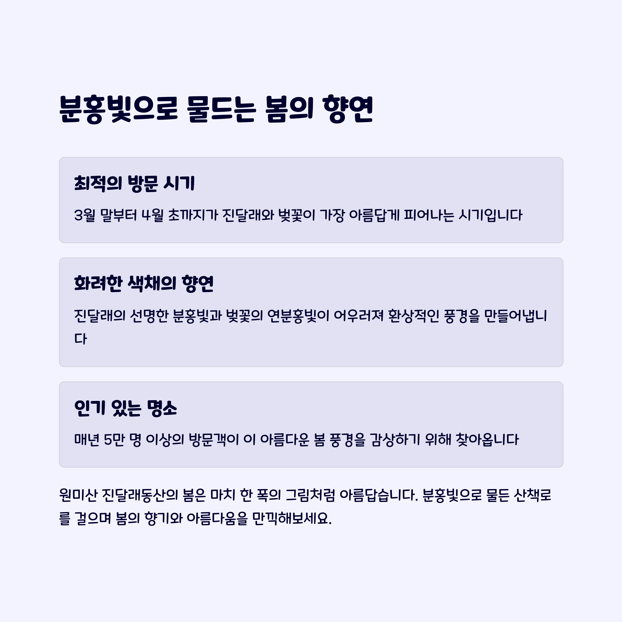 | 4월 초부터 중반까지가 가장 최적인 시기입니다. 진달래꽃이 만개할 때 수많은 방문객들이 이곳에서 촬영을 즐깁니다. 일출 및 일몰 시각은 사진의 아름다움을 극대화합니다. 날씨가 맑은 날 방문하면 더욱 특별한 순간을 기록할 수 있습니다. 이 장소는 사진 촬영을 위해 많은 준비와 노력이 필요합니다. |