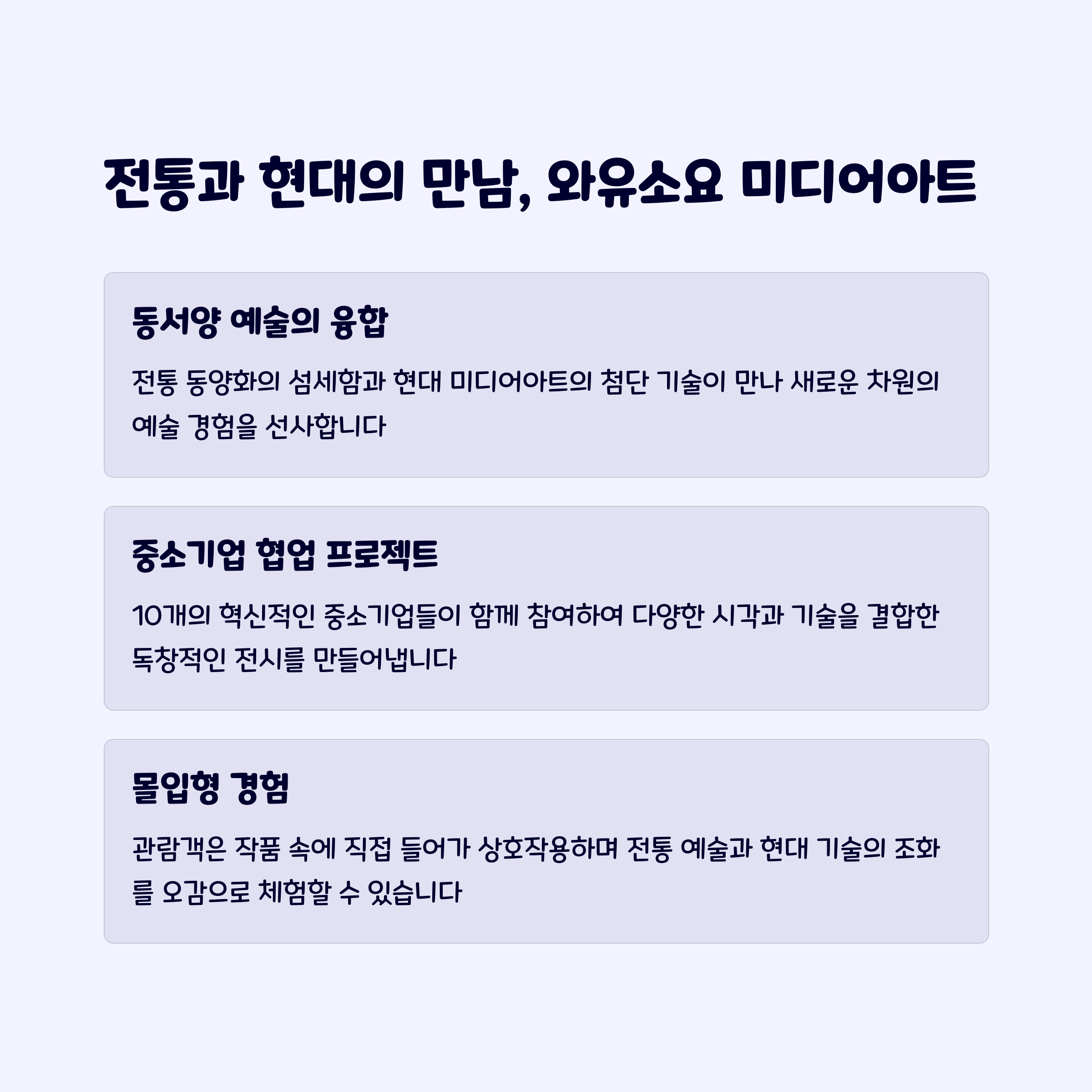 또한, 미디어아트 전시 "와유소요"는 동양화의 전통적 아름다움과 현대 기술을 결합해 각광받고 있는 전시였습니다.