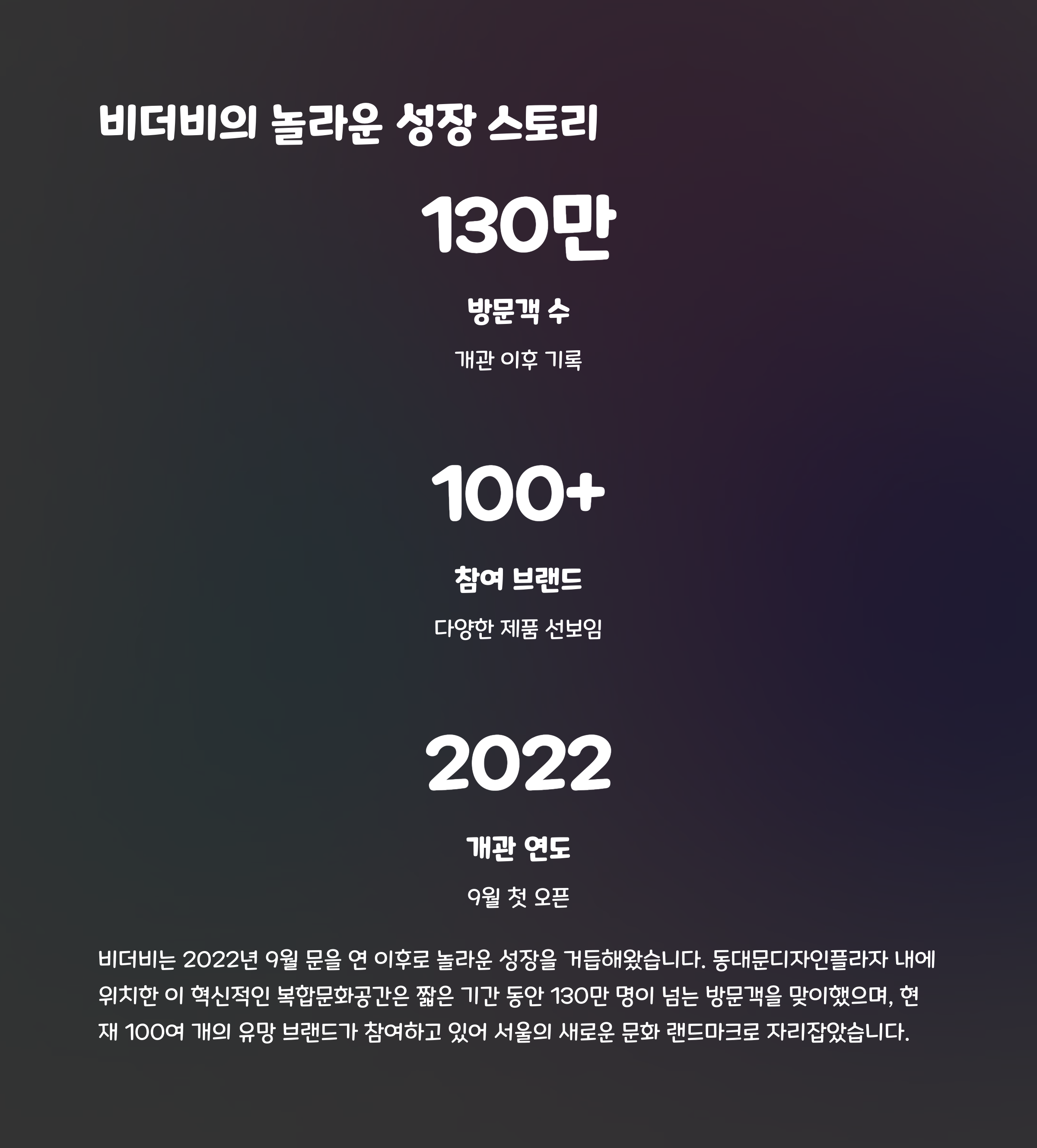 130만 명의 방문객이 경험한 다양한 콘텐츠는 앞으로의 도시형 문화 공간 모델로 자리잡고 있습니다.