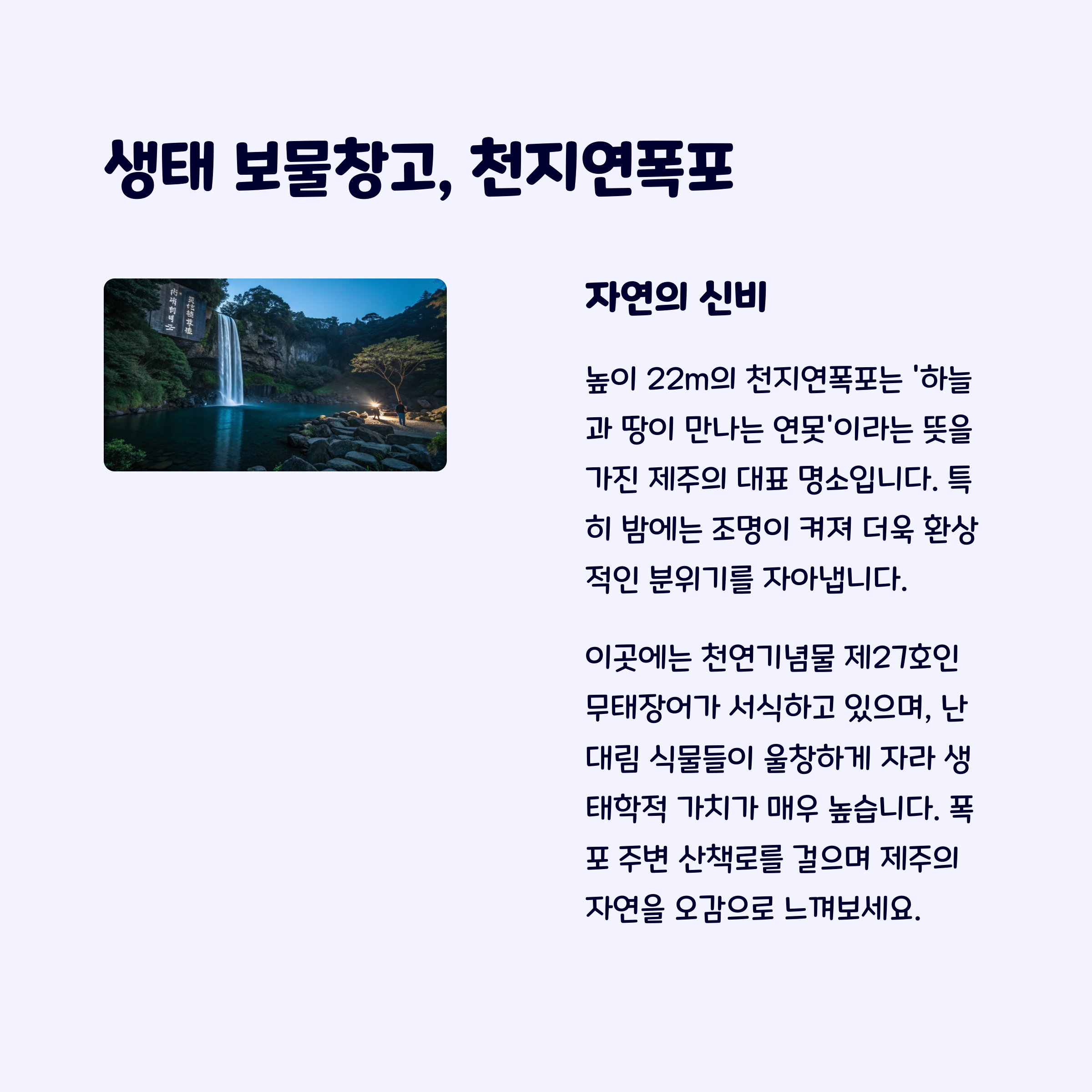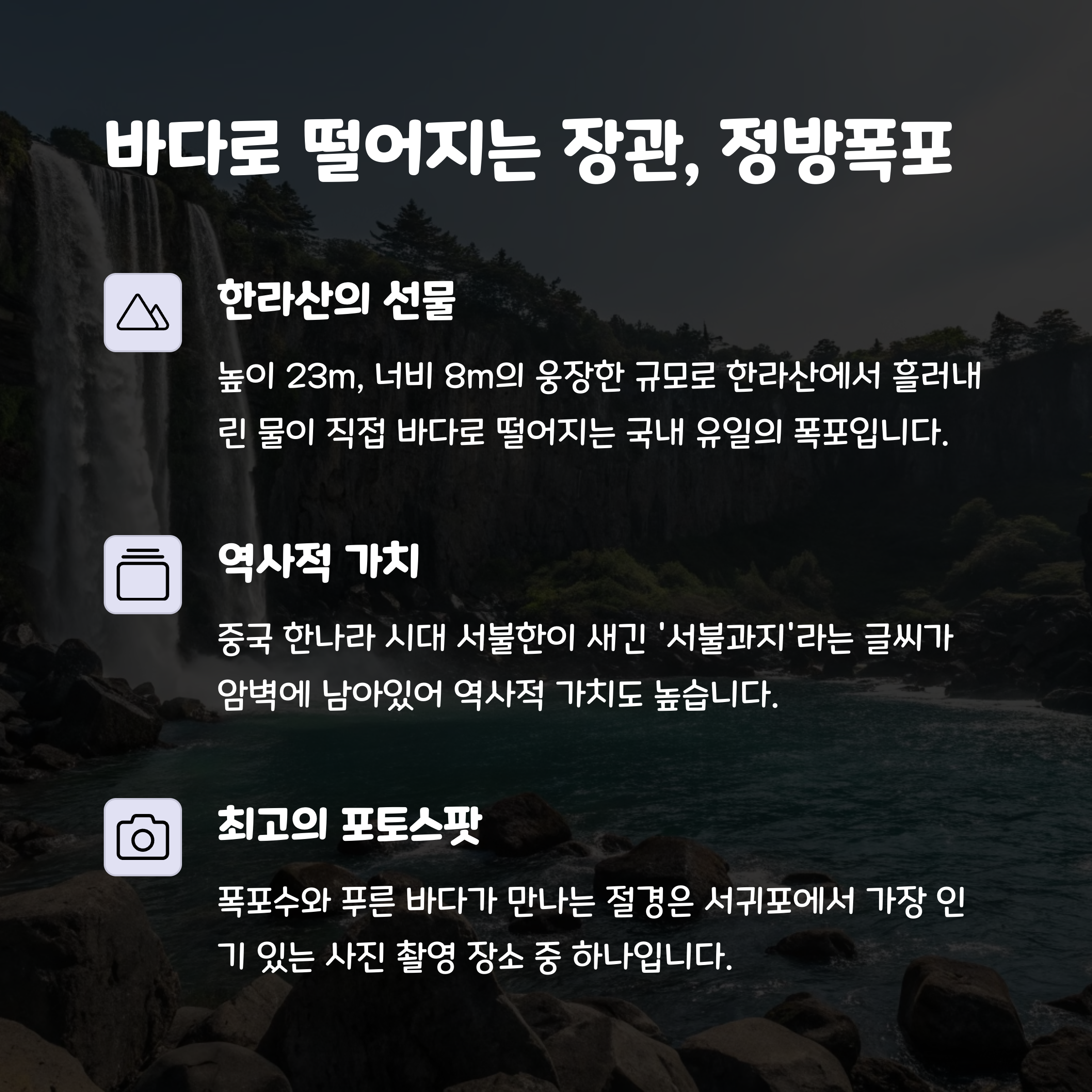 정방폭포천지연폭포 같은 대표 명소는 제주도의 특별함을 느끼게 해줍니다.