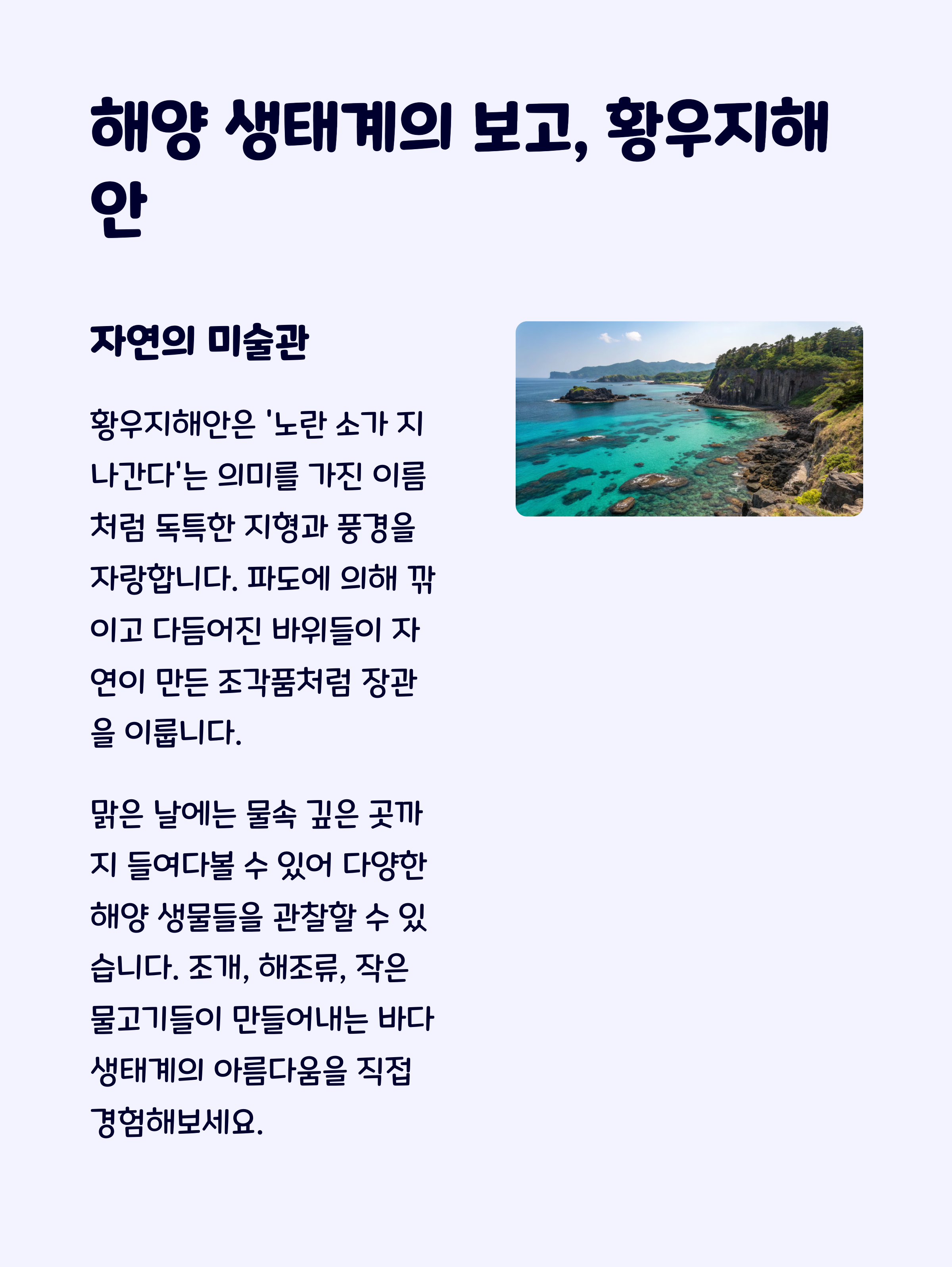 반면, 황우지해안은 더욱 조용하고 아늑한 분위기 속에서 해안 생태계를 즐길 수 있는 곳입니다.