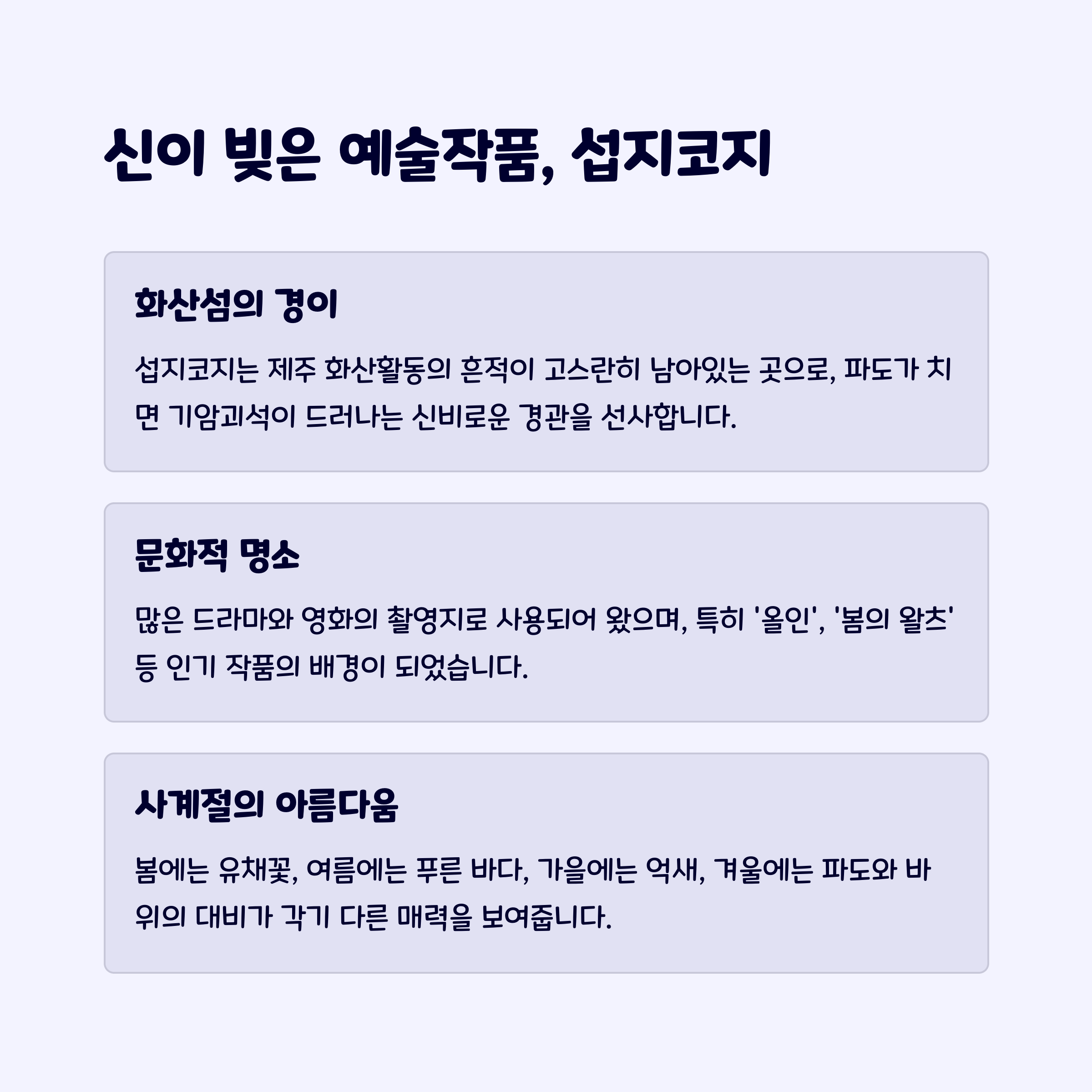 섭지코지의 이국적인 경관과 황우지해안의 평화로운 분위기는 여행의 묘미를 더합니다.