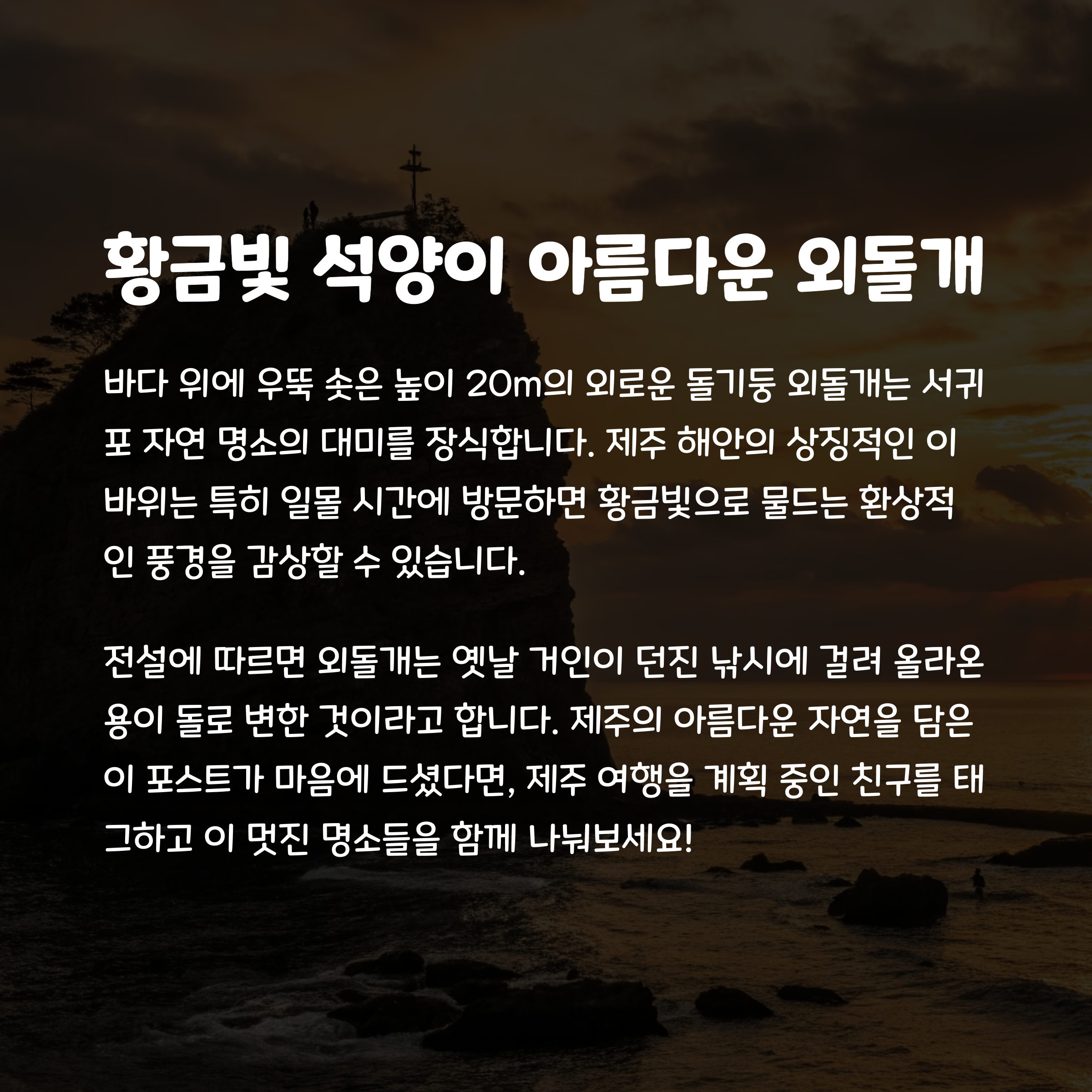 마지막으로 소개하는 외돌개는 서귀포에서 유명한 일몰 명소로, 해가 질 때의 아름다운 해안을 놓치지 마세요.