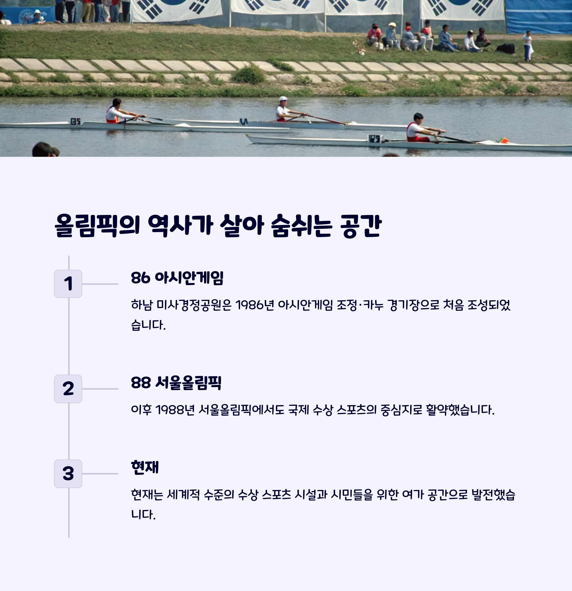 하남 미사경정공원은 86 아시안게임과 88 서울올림픽 당시 조정·카누 경기장을 기반으로 조성된 대규모 복합 공원입니다.