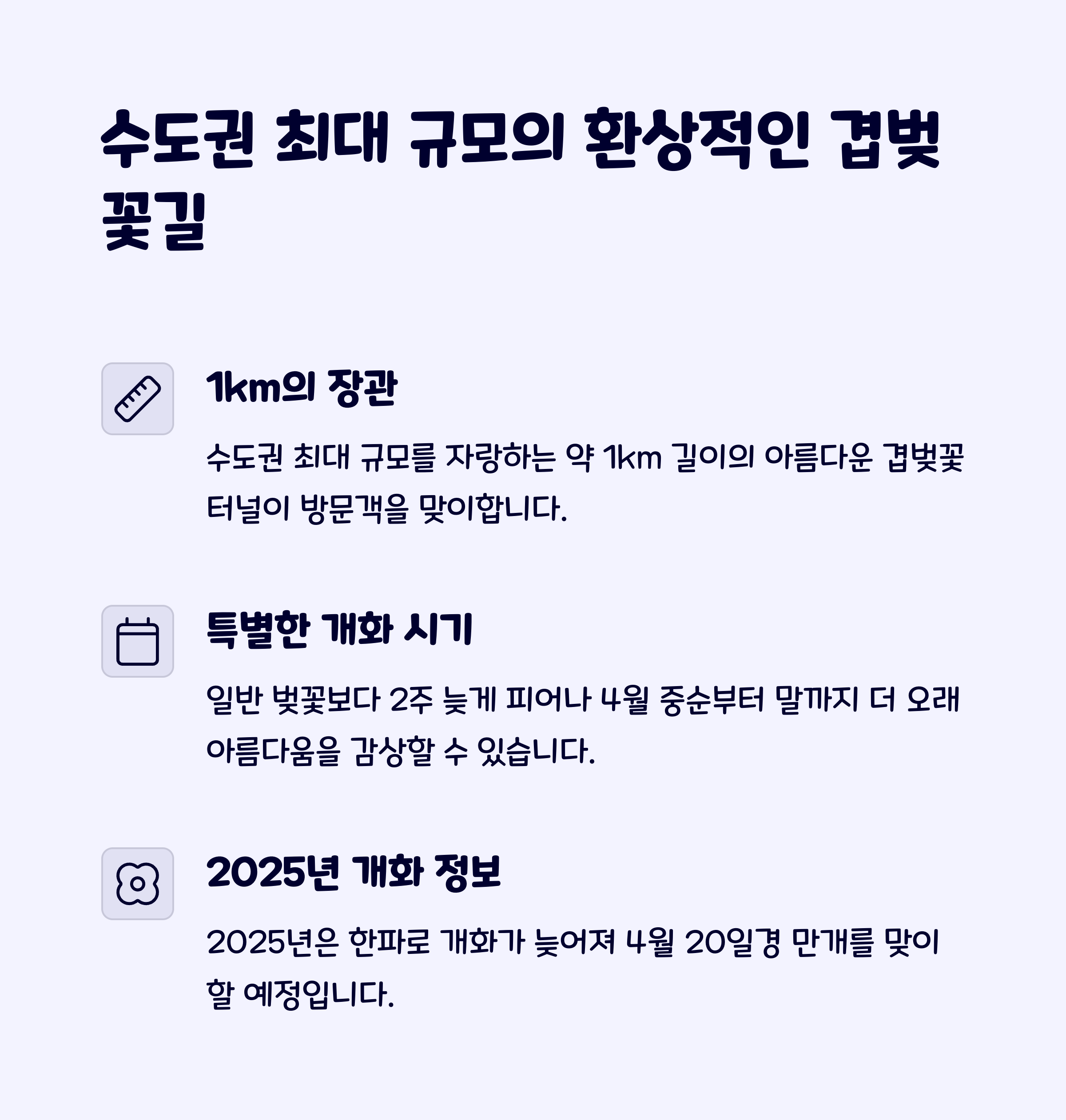 A: 2025년에는 4월 13~14일 주말까지가 마지막 절정입니다. 일반 벚꽃보다 늦게 피니, 벚꽃을 놓쳤더라도 겹벚꽃으로 봄을 만끽하세요!