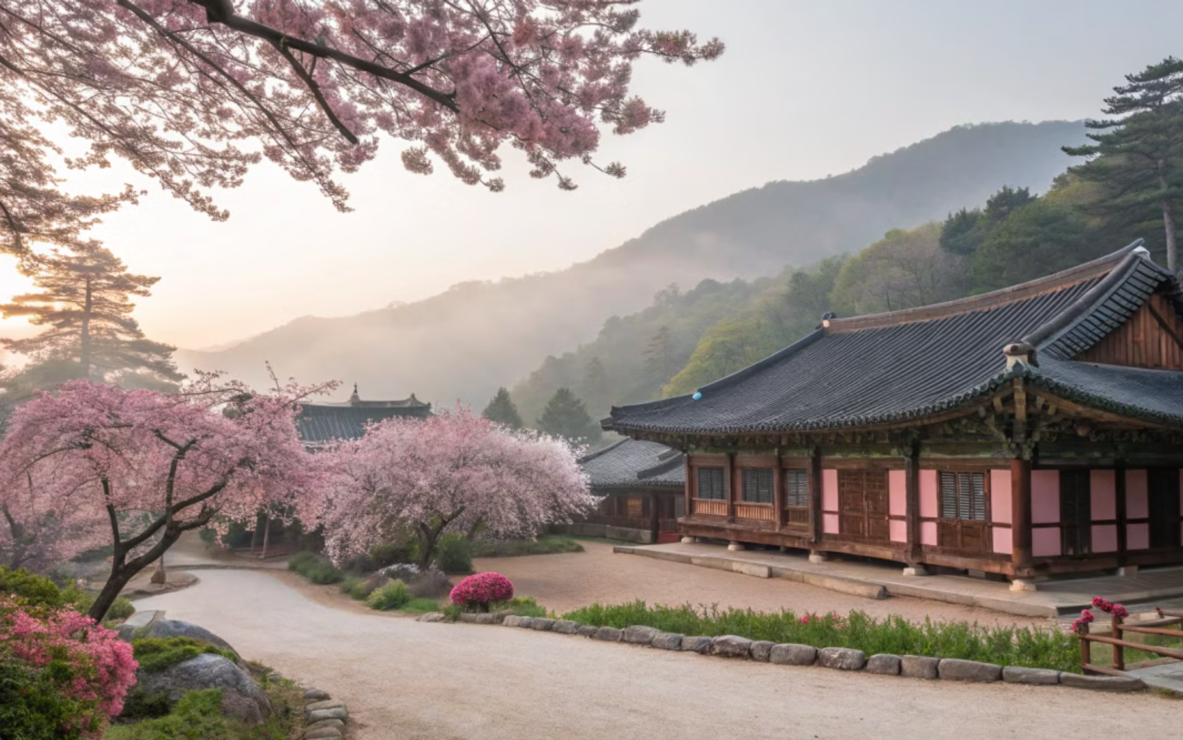 사찰의 고즈넉함과 화려한 꽃의 조화는 마치 동화 속 풍경처럼 느껴집니다.